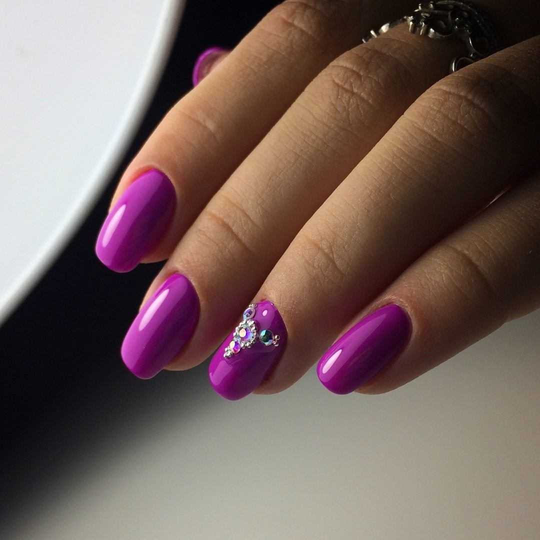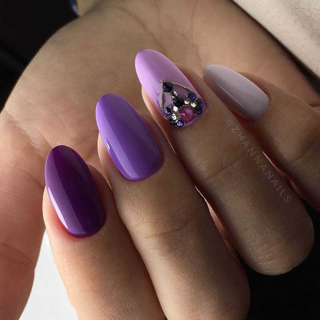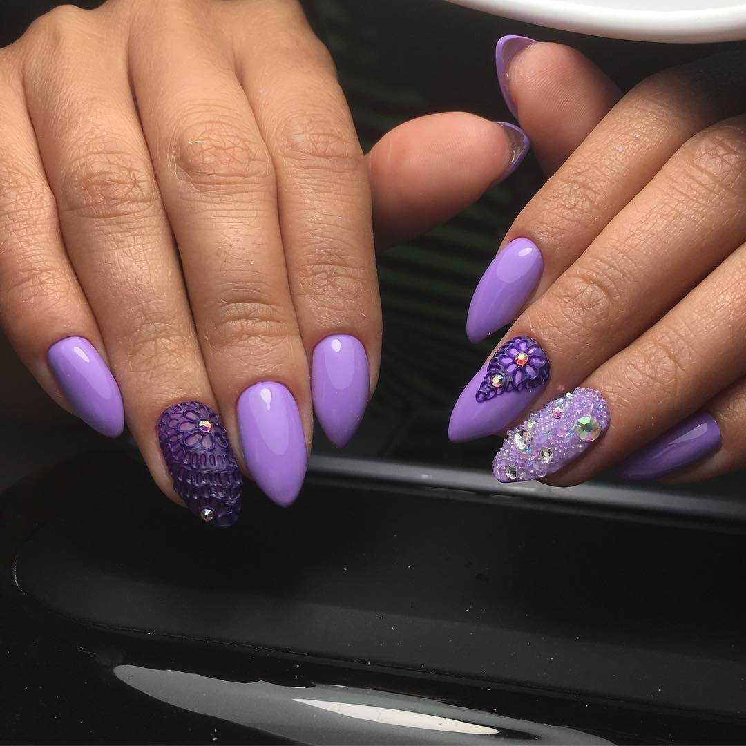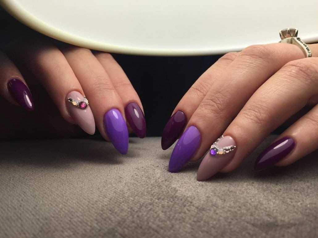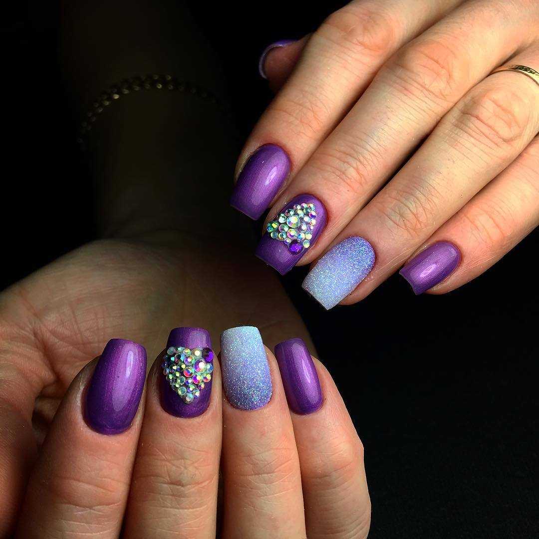 Разнообразие цветов фиолетового маникюра и их сочетаний порой удивляет. Здесь уместны любые оттенки от ярко-лилового до нежно сиреневого, или полночно темно-фиолетового.