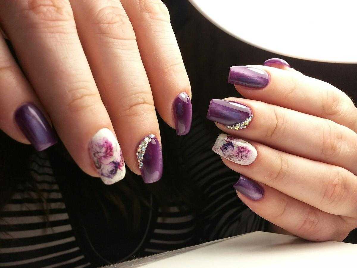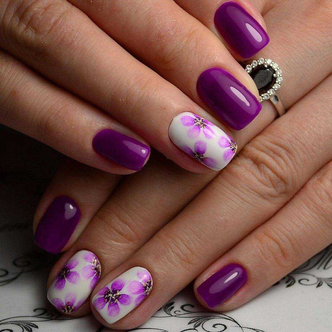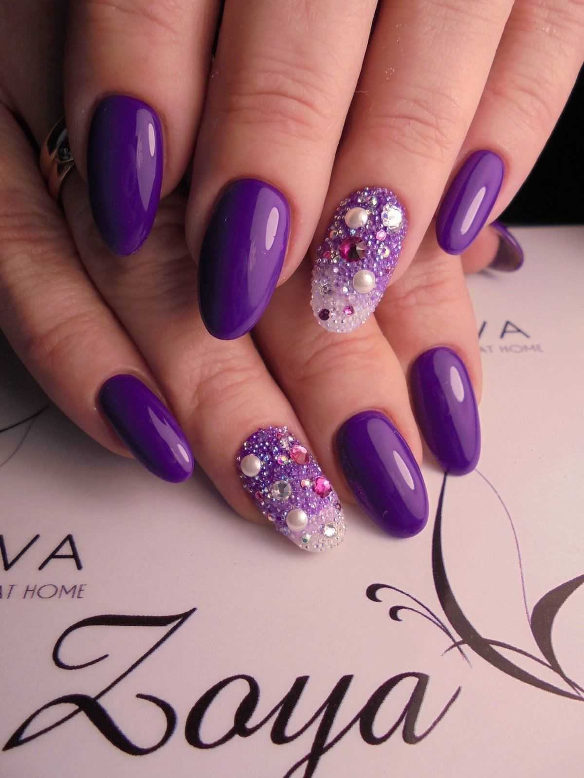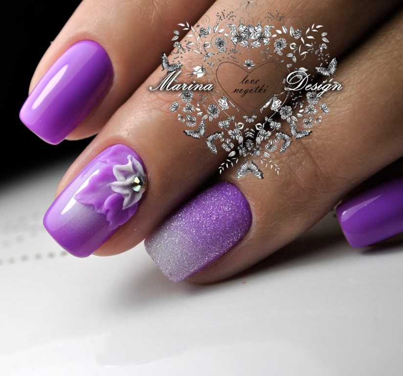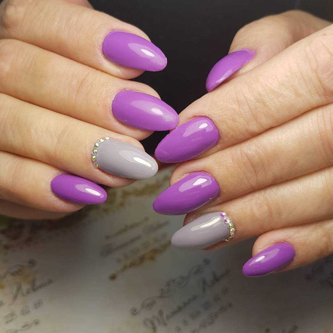 Разнообразие цветов фиолетового маникюра и их сочетаний порой удивляет. Здесь уместны любые оттенки от ярко-лилового до нежно сиреневого, или полночно темно-фиолетового.