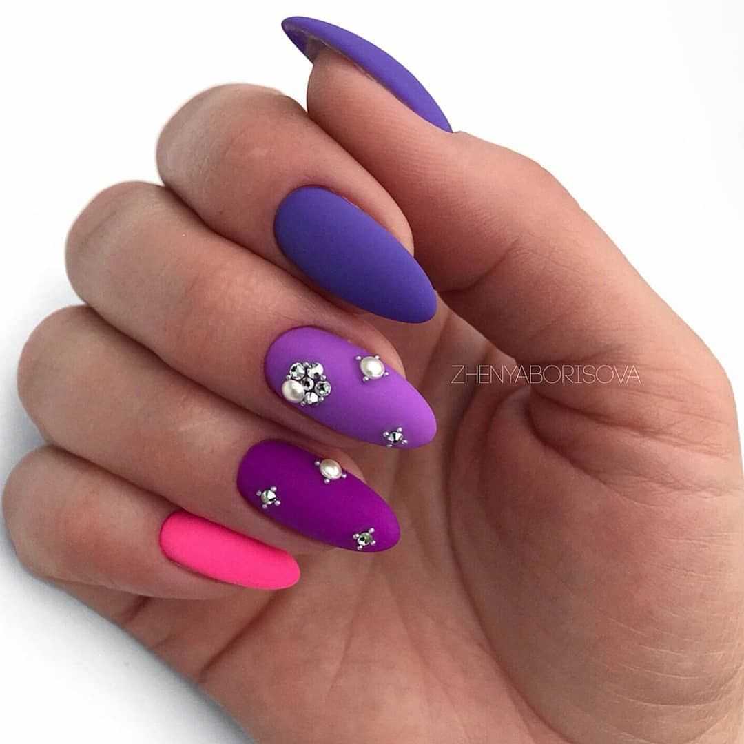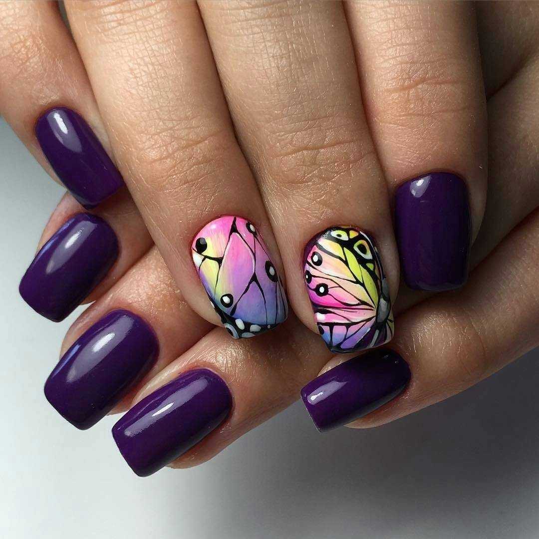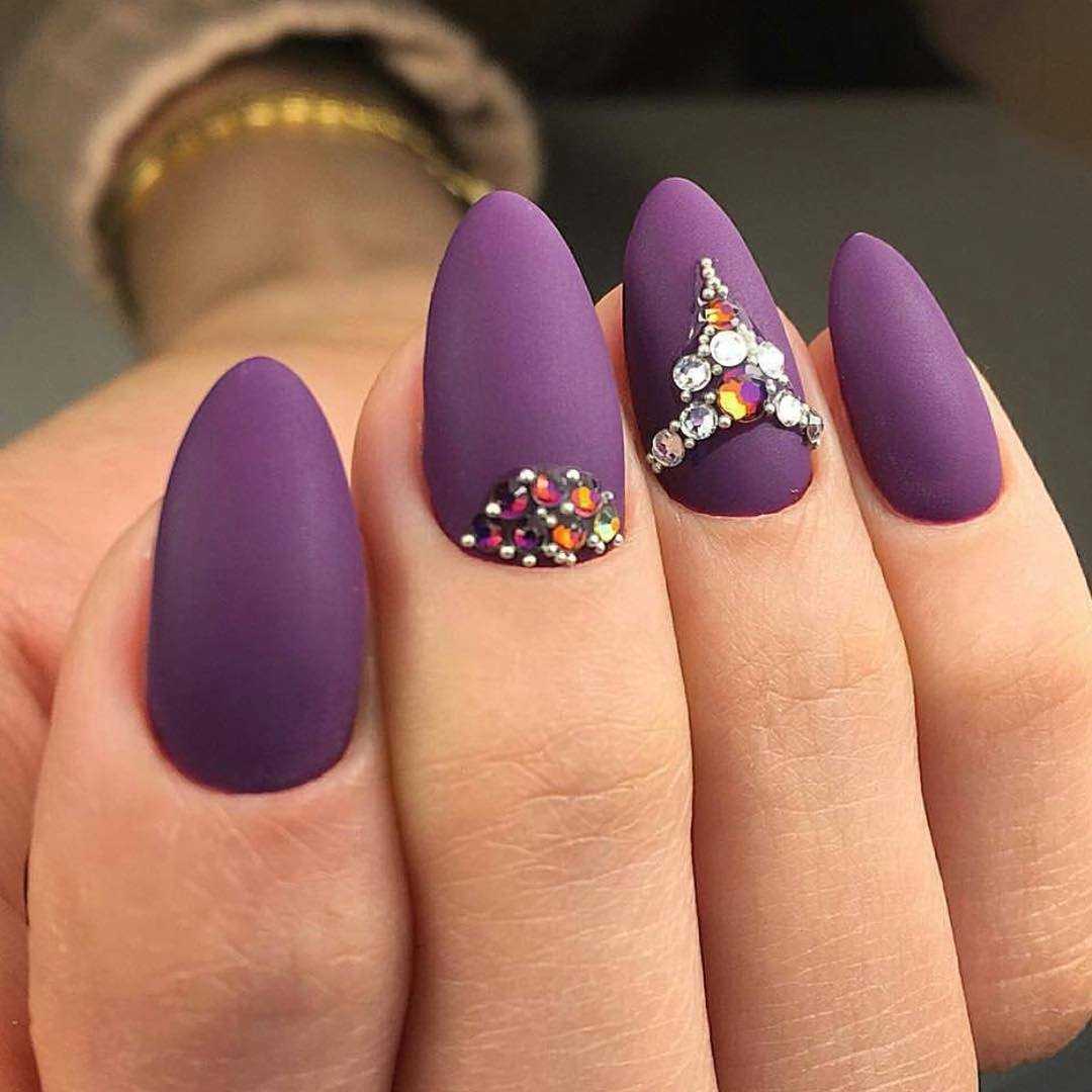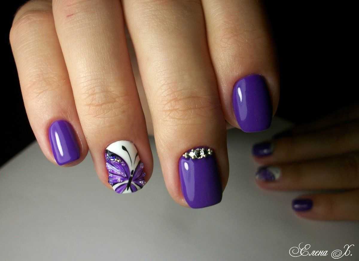 Разнообразие цветов фиолетового маникюра и их сочетаний порой удивляет. Здесь уместны любые оттенки от ярко-лилового до нежно сиреневого, или полночно темно-фиолетового.