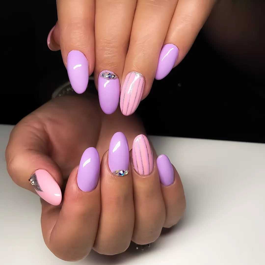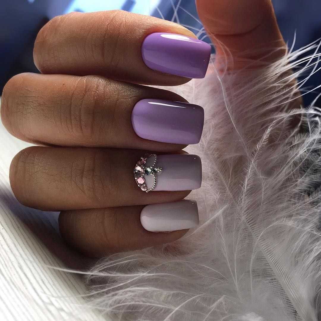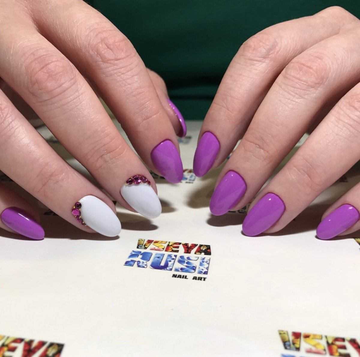 Это предложение станет идеальным выбором для тех, кто ещё не раскрыл для себя особенности сиреневого оттенка или считает однотонное покрытие слишком «приторным». Покройте нейтральным белым несколько ногтевых пластин и дополните их парой блестящих кристаллов или модными слайдерами. Таким образом вы измените используемую ранее концепцию и освежите ноготки.