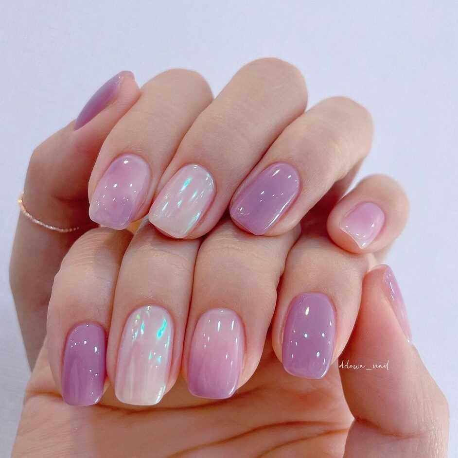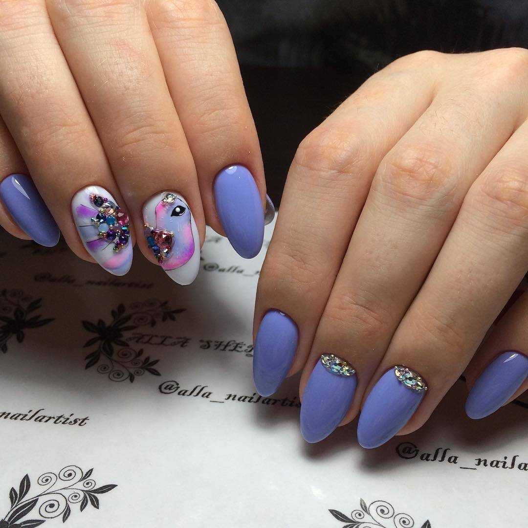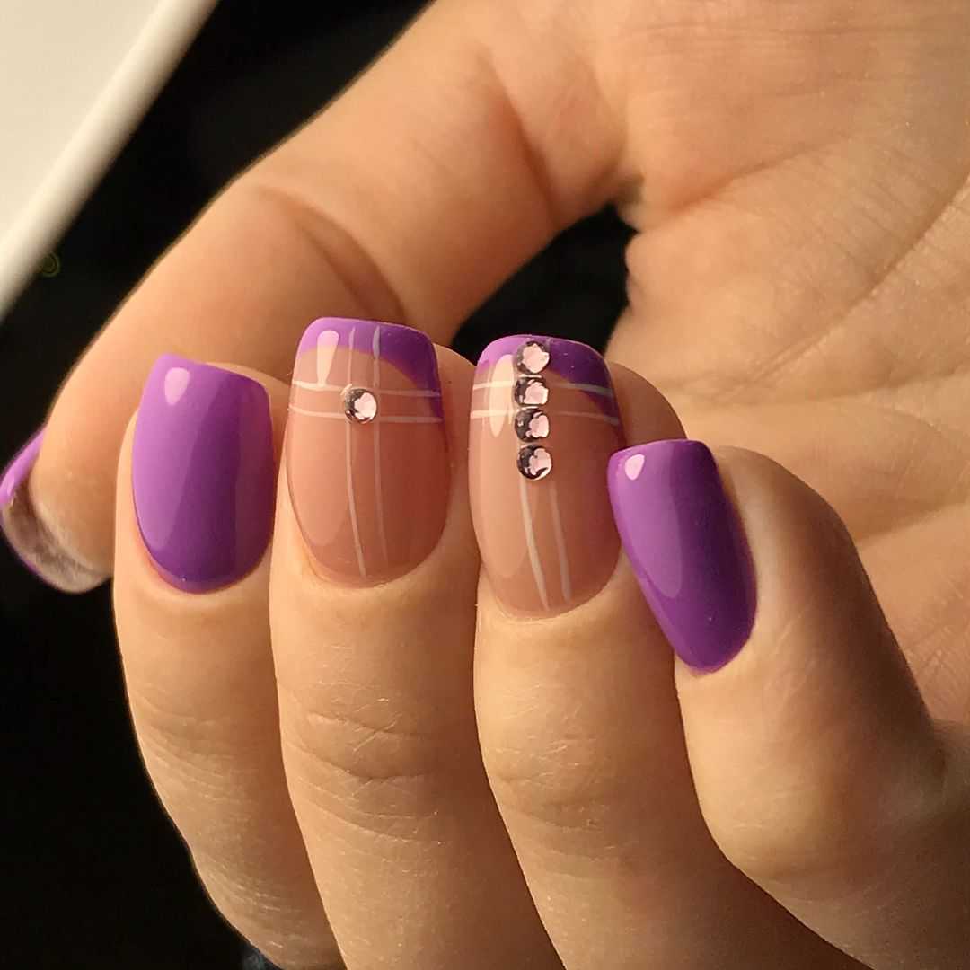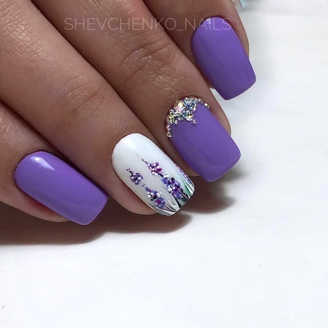 Это предложение станет идеальным выбором для тех, кто ещё не раскрыл для себя особенности сиреневого оттенка или считает однотонное покрытие слишком «приторным». Покройте нейтральным белым несколько ногтевых пластин и дополните их парой блестящих кристаллов или модными слайдерами. Таким образом вы измените используемую ранее концепцию и освежите ноготки.