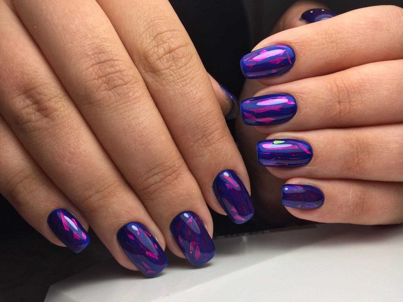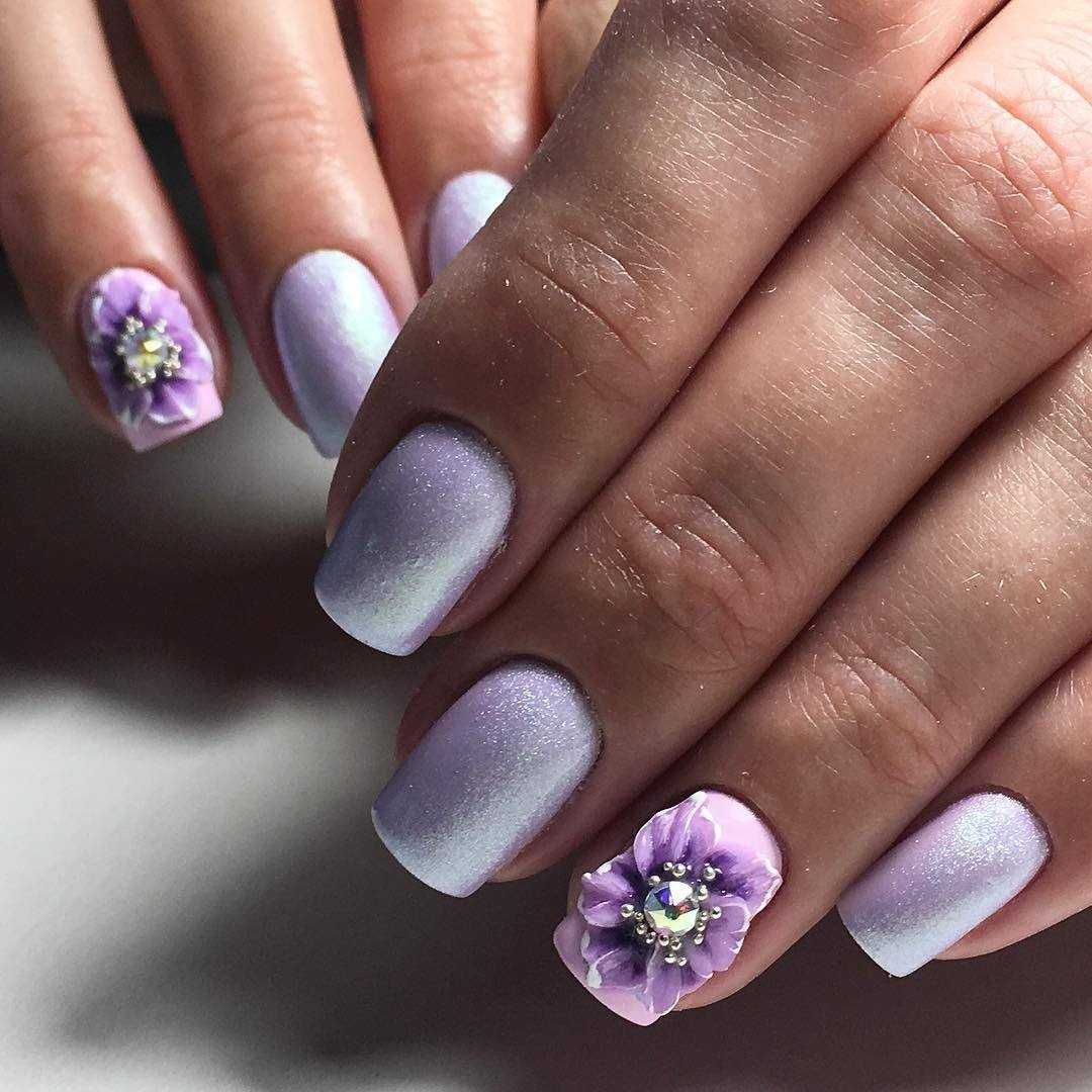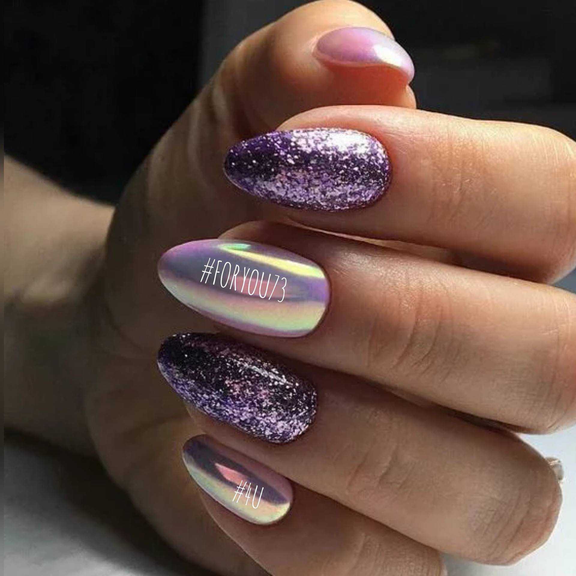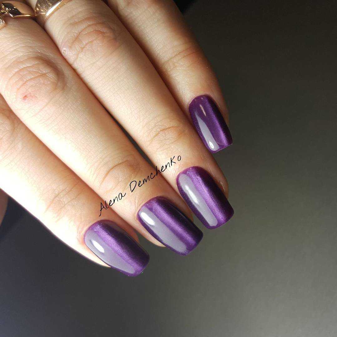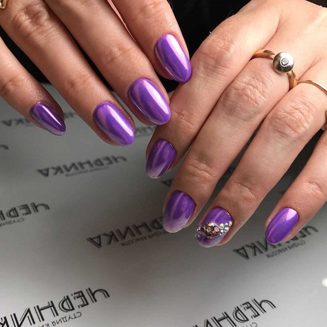 Если хочется большего разнообразия выбирайте один из вариантов дизайна — кошачий глаз, втирка, градиент в сиреневых тонах или отделка ноготков фольгой.