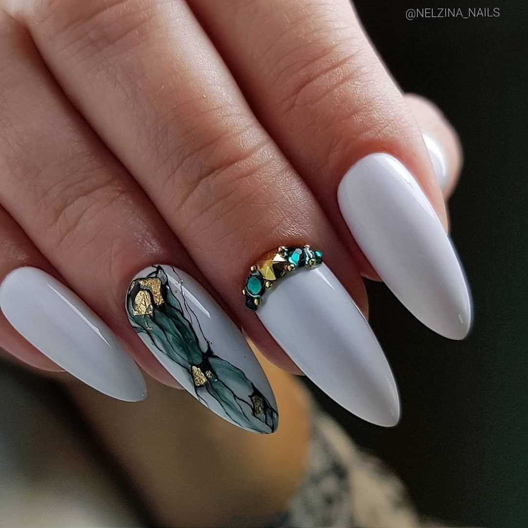 Нежный нейл-арт со стразами на миндалевидных ногтях