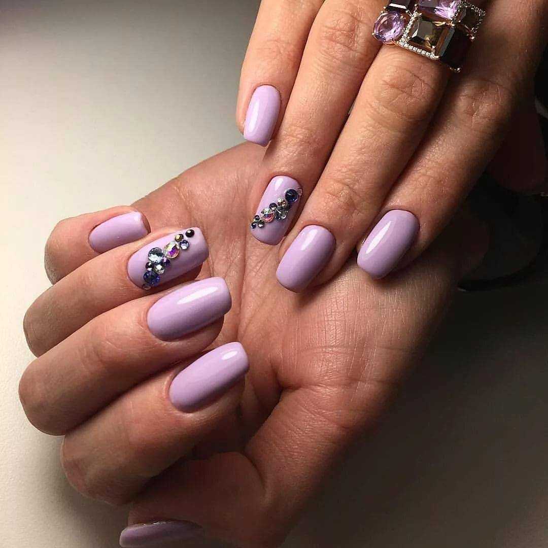 Бледные плотные мелованные сиреневые оттенки смотрятся романтично и очень нежно. В этом сезоне наиболее популярными являются тона, уходящие в серый или пепел, но не в розовую гамму. Такой однотонный маникюр впишется как в строгий офисный образ, так и в яркий вечерний.