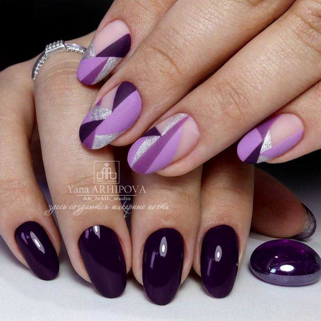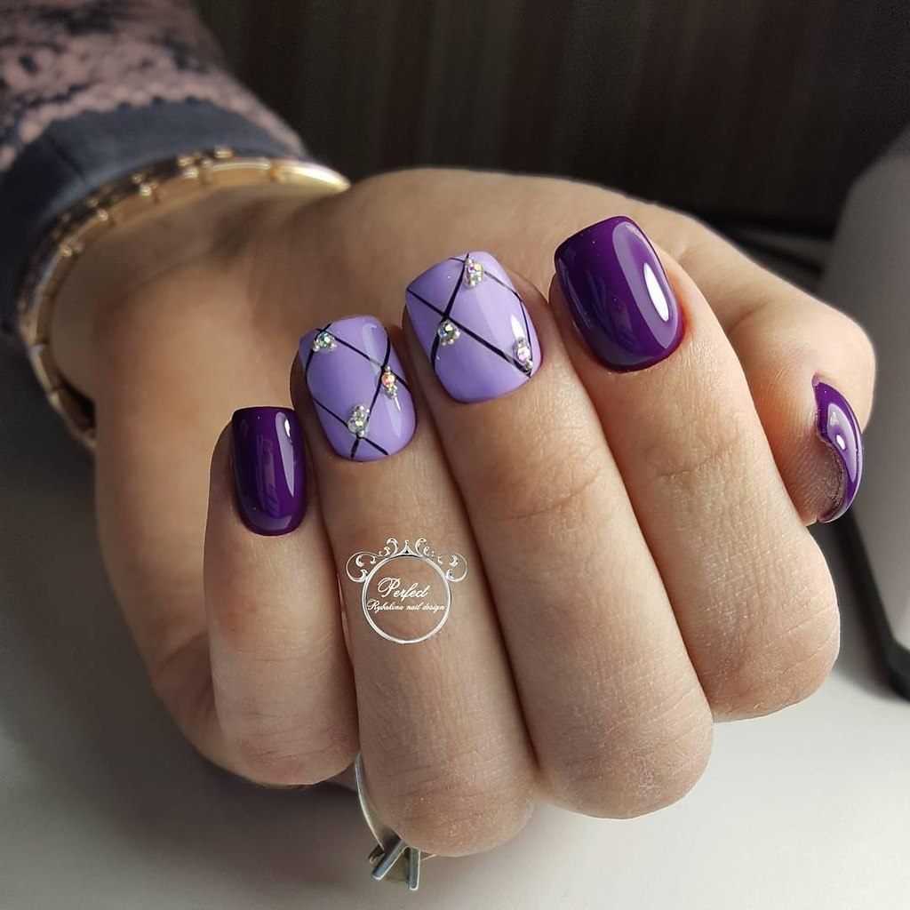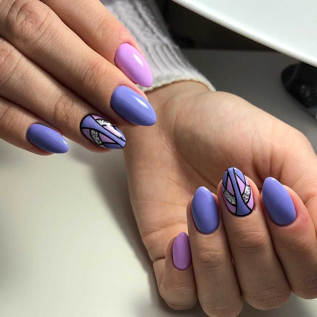 Маникюр с геометрическими рисунками всегда смотрится необычно, свежо и привлекательно, поэтому в 2021 году дизайнеры не оставили в стороне идею совместить на ноготках многогранный сиреневый лак и геометрические мотивы. Всевозможные фигуры и полоски могут иметь вид графического рисунка, наноситься на основание в хаотичном порядке или представлять собой сложные композиции – вариаций множество. При этом можно дополнительно использовать фольгу в качестве подложки, перламутровую втирку либо прорисовывать детали при помощи жидкого глиттера.