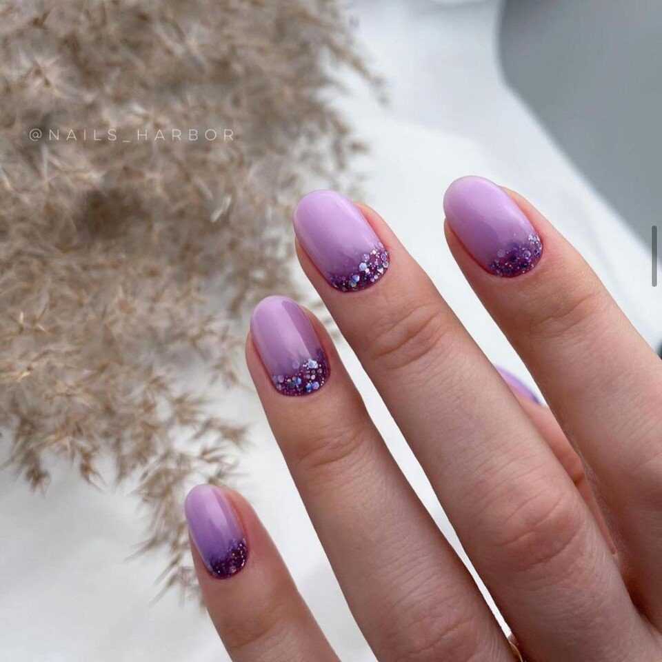 Праздничный сиреневый маникюр может быть глянцевым, с обилием элементов декора и блесток. Дизайн, предназначенный для деловой обстановки, должен соответствовать официальному стилю и выглядеть максимально естественно.