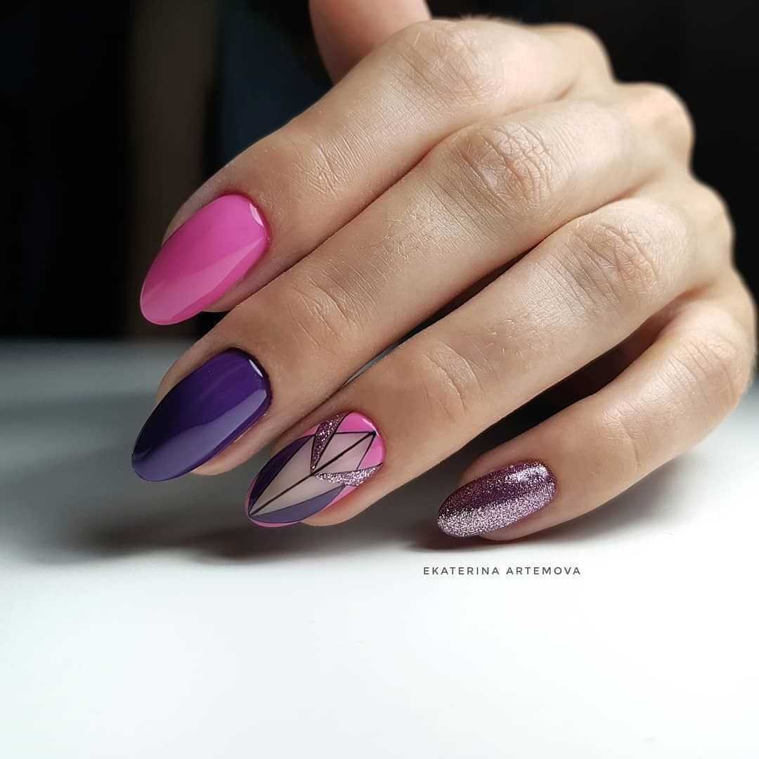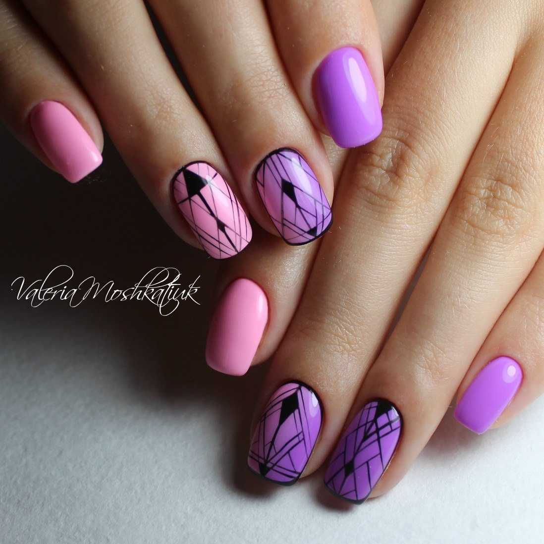 Подобное сочетание можно уверенно назвать одним из самых распространённых. При этом не стоит думать, что популярность означает обыденность. Наоборот, тандем розового и сиреневого предоставляет модницам множество идей маникюра и всегда смотрится свежо. Среди актуальных предложений удивительные переходы в стиле градиент, которые можно создавать не только на каждой ногтевой пластине, но и от ноготка к ноготку, использование акриловой пудры с характерным оттенком и абстрактные изображения. Весьма эффектно смотрится в розово-сиреневом исполнении комбинирование однотонного нейл-арта с элементами «негативного пространства» и многие другие идеи.