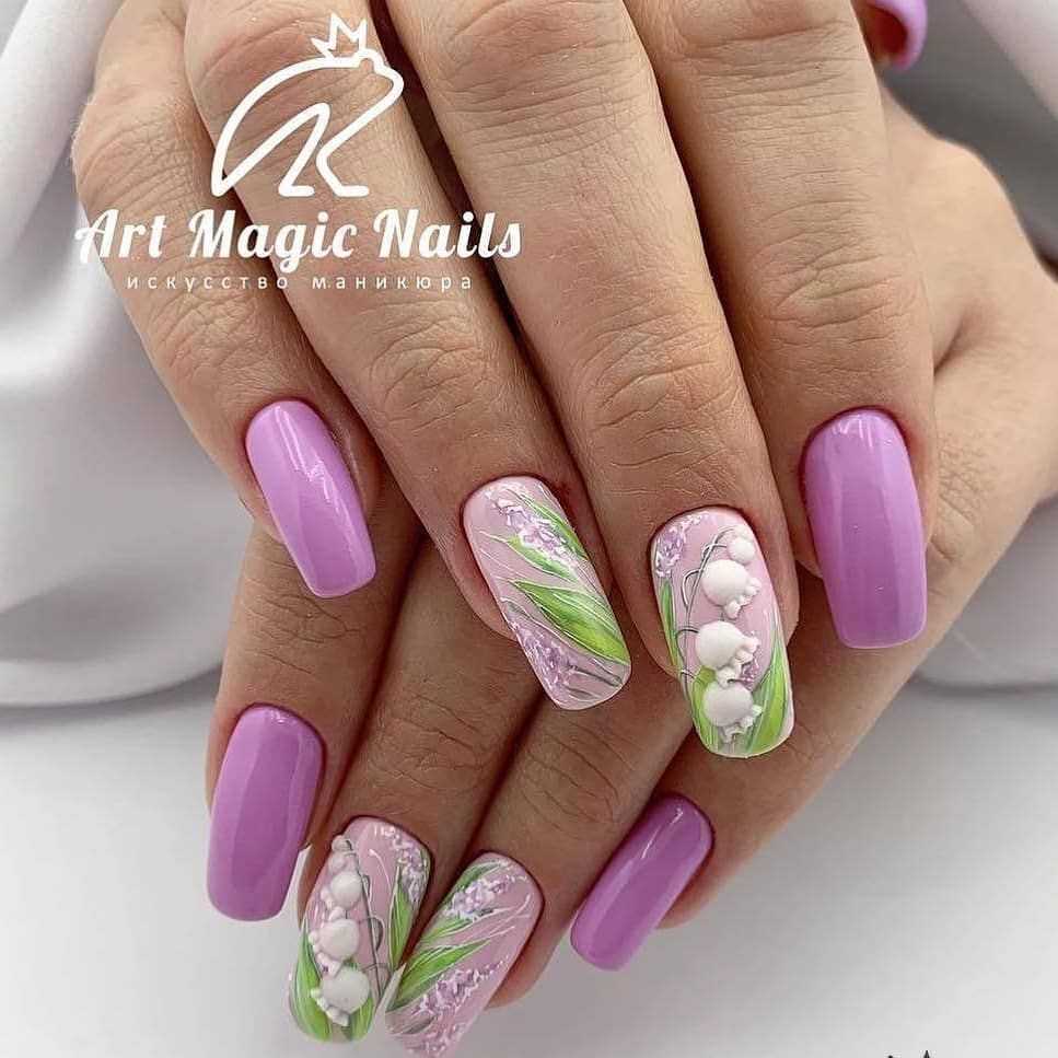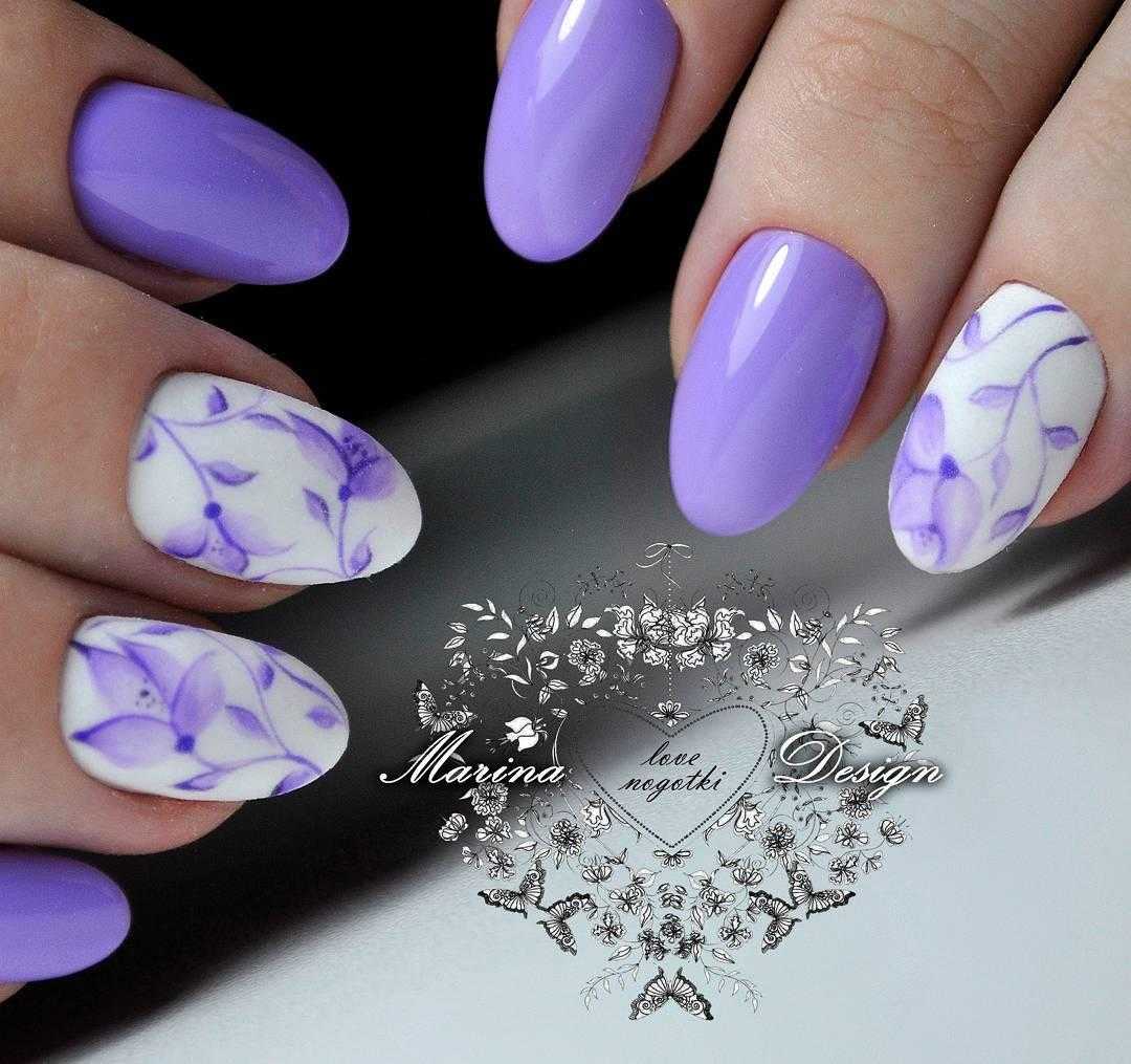 Не стоит думать, что сиреневый это всего один тон. В природе существует множество оттенков сирени — темный, светлый, доходящий практически до белого. Здесь много вариантов дизайна маникюра — градиент от сирени к чисто белому, весенние рисунки на сиреневом фоне, сочетание с серебром, геометрия, классический френч и интересное оформление лунок.