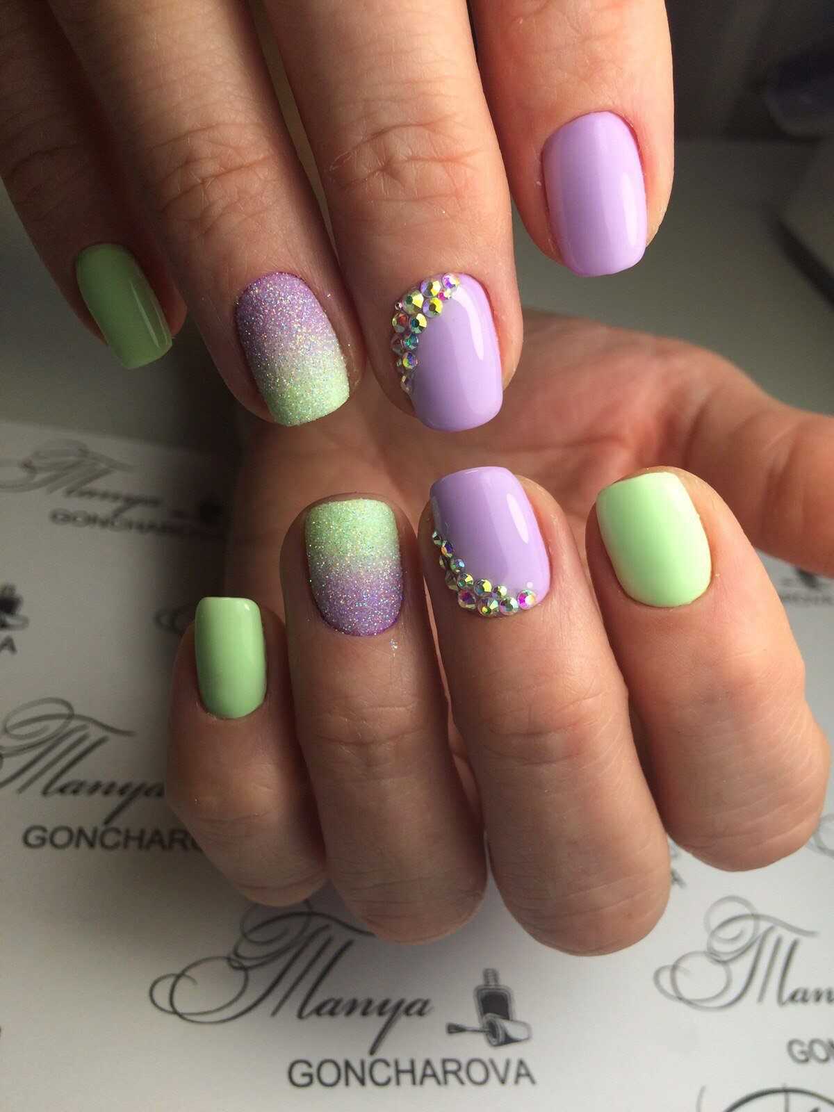 В примере сочетания солнечного жёлтого и сиреневого предпочтительно выбирать из оттенков пастельной палитры, что позволит немного сгладить яркость первого и подчеркнёт нежность второго из используемых тонов. Нанесите жёлтый на пару ноготков и дополните основание бусинами, мелкими стразами, узорами в стиле «перепелиных яиц» или «брызги красками». Ваши ручки с таким маникюром не останутся без внимания.