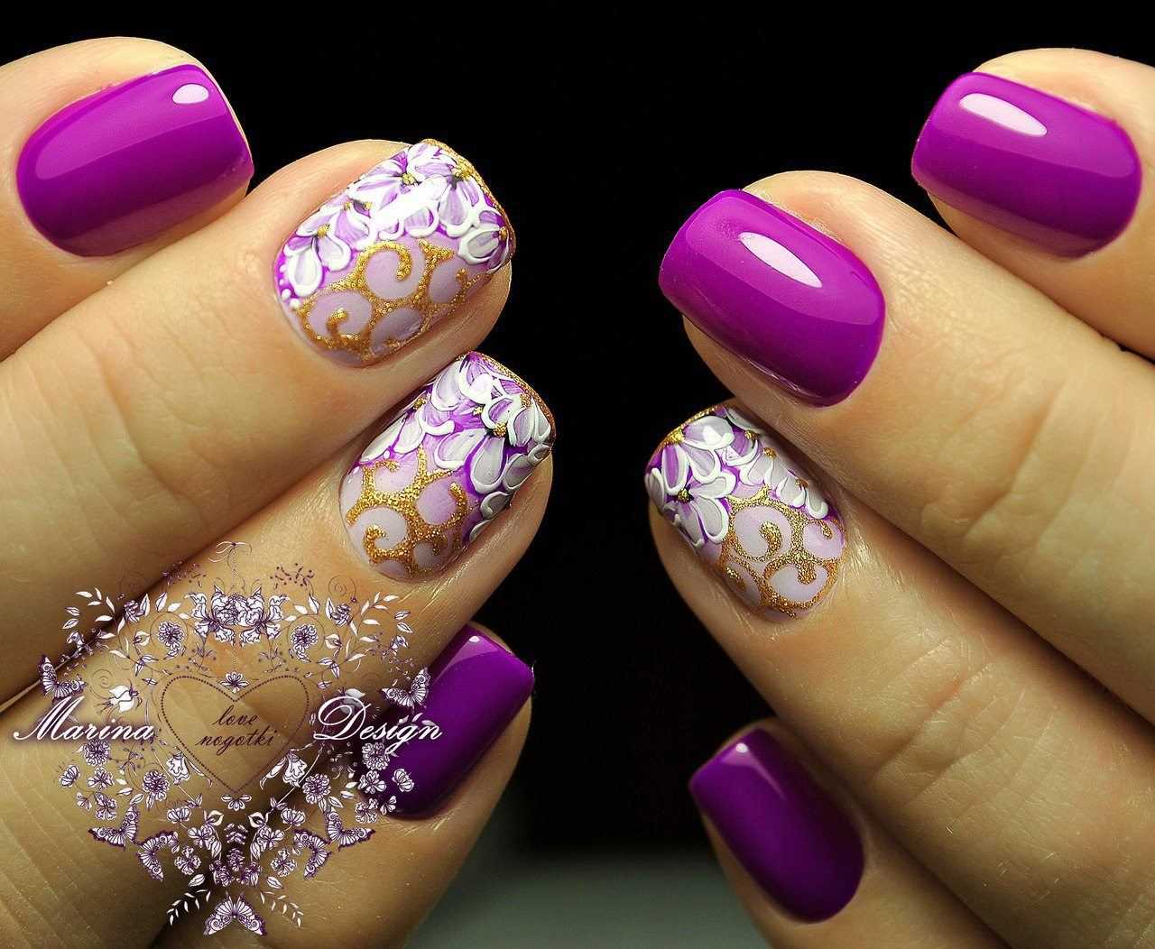 Золотистые и серебристые оттенки позволяют создавать яркие акценты. Они отлично смотрятся на сиреневом фоне. Нежно-лиловая основа может быть декорирована глиттером, узорами из стразам, фольгой, стиркой. Кружевной золотистый нейл-арт или ажурная роспись помогут создать оригинальный образ.