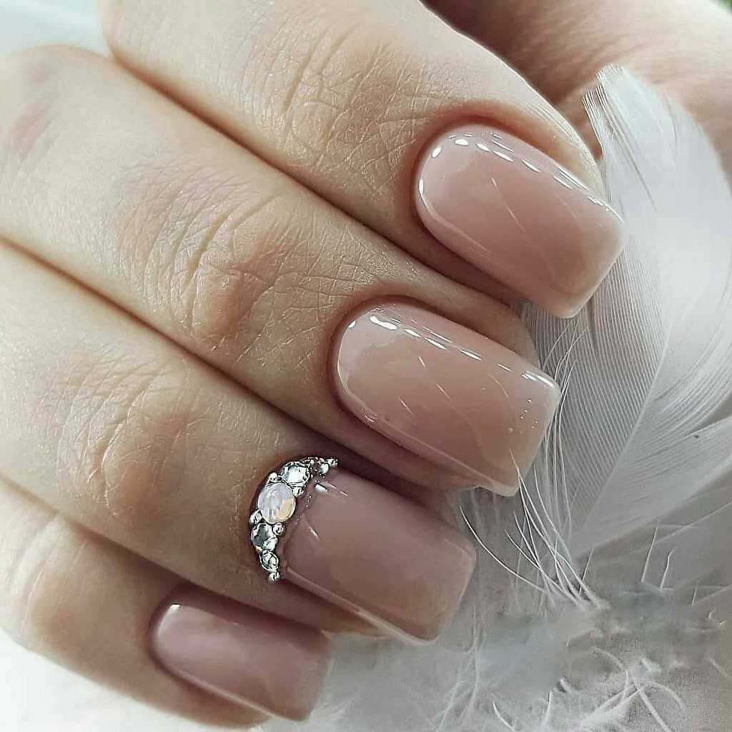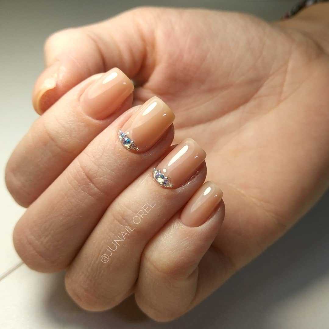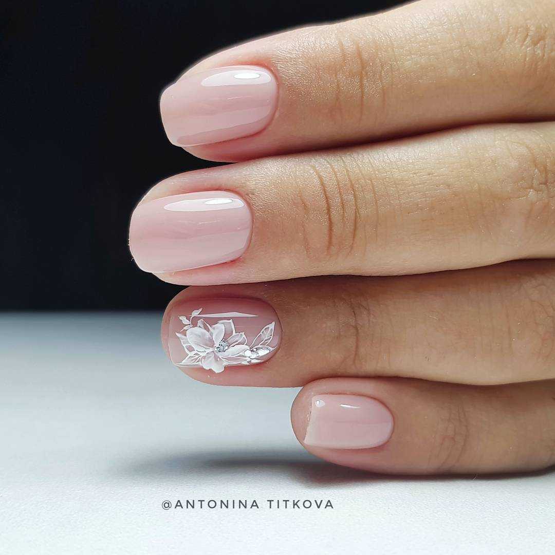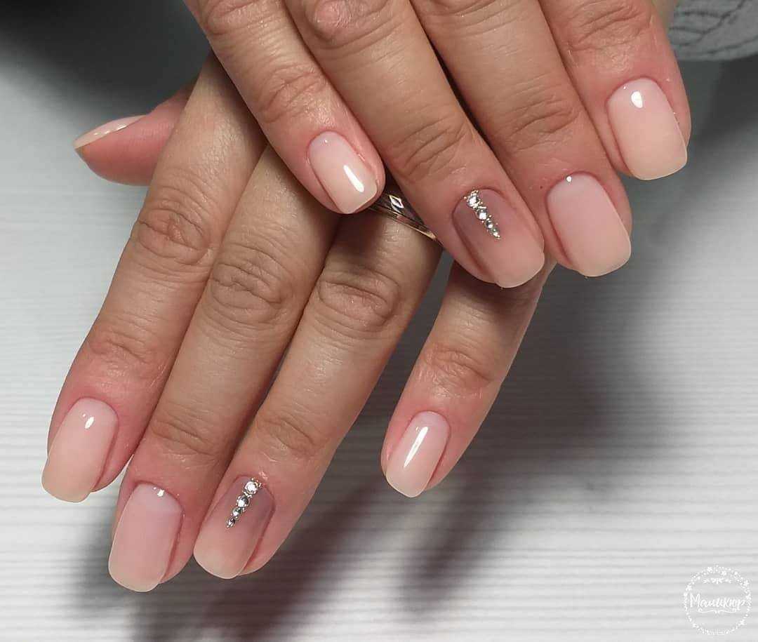 Для ногтей бледных оттенков можно добавить украшения в виде стразов, цветочных узоров, линий, посыпки или перламутра. Красивые однотонные оттенки, совпадающие с цветом кожи максимально зрительно удлиняют пальцы.