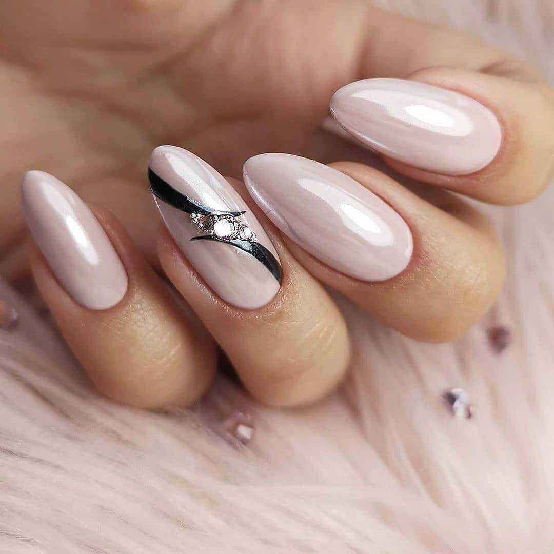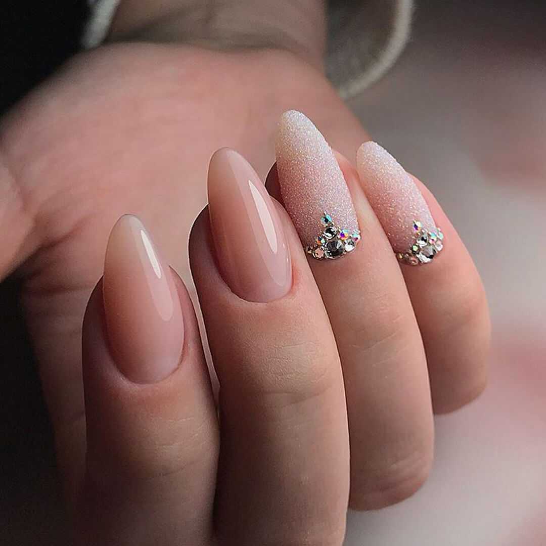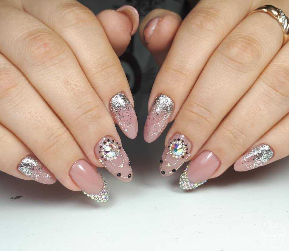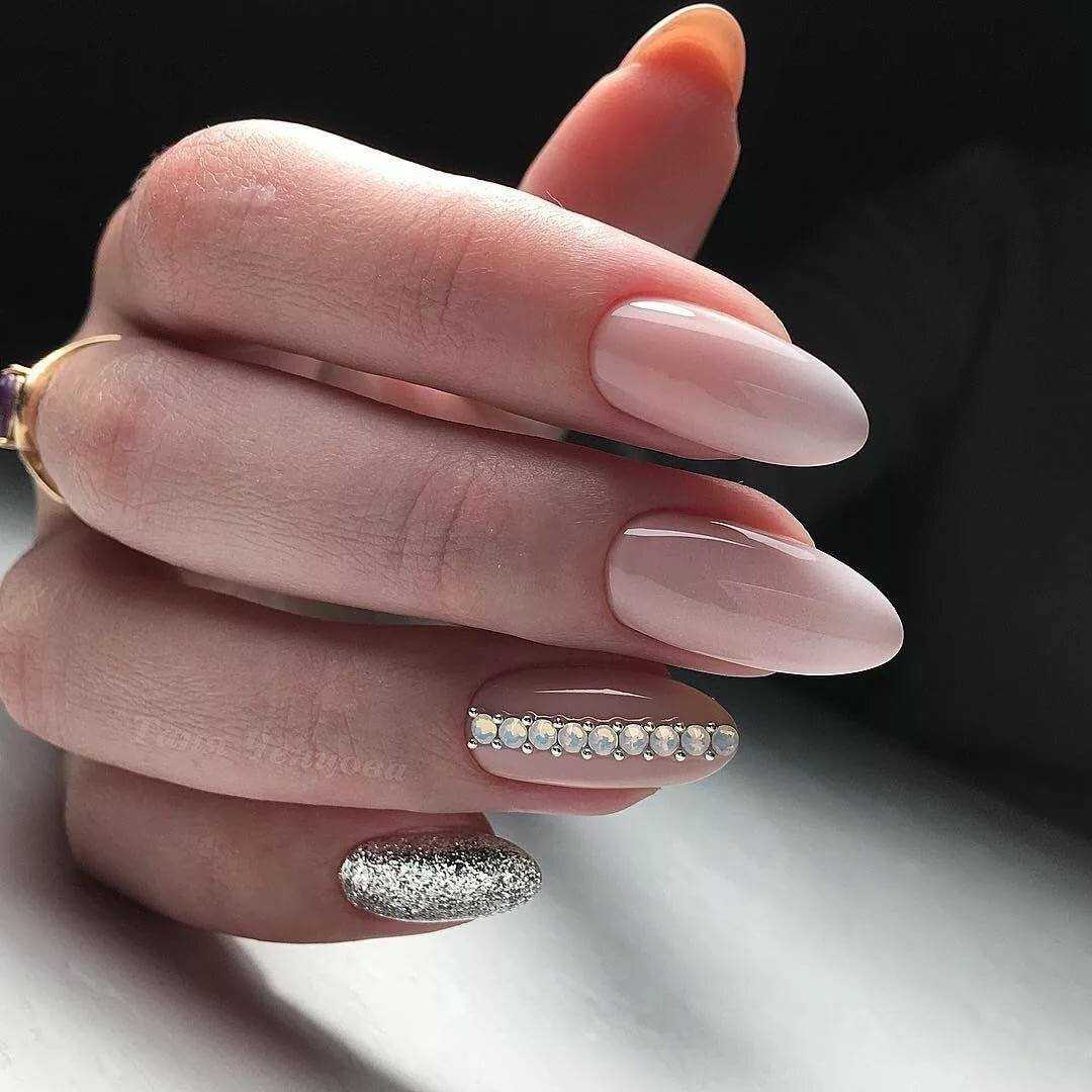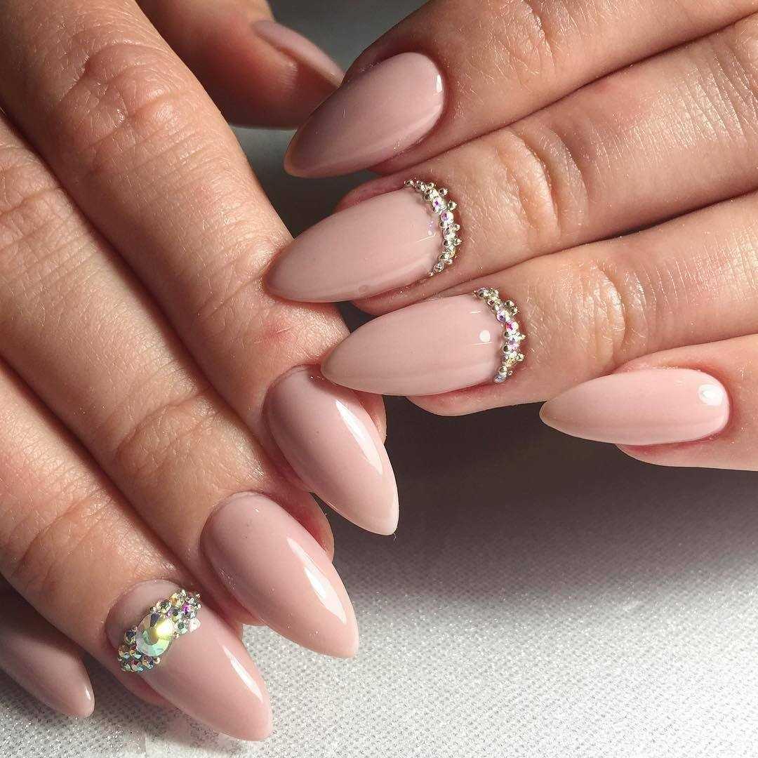 Если вам по душе более нежные и лаконичные вариации маникюра, то стоит обратить внимание на нюдовую палитру оттенков, которая чудесно сочетается на миндалевидных ногтях с блестящими дополнениями и актуальна в любой ситуации, вне зависимости от времени года за окном. Это может быть потрясающий нейл в стилистике нового года с блёстками и тематическими рисунками, миниатюрные бутоны, тонкие линии или изображения геометрического характера