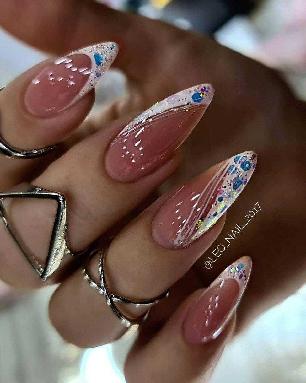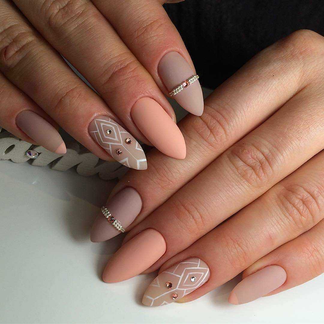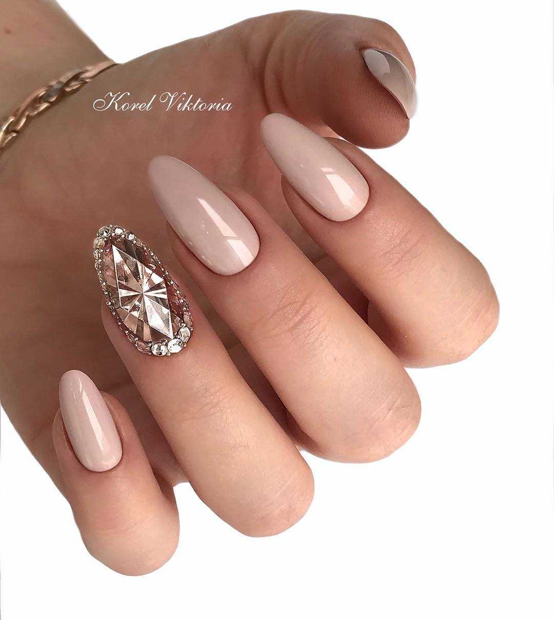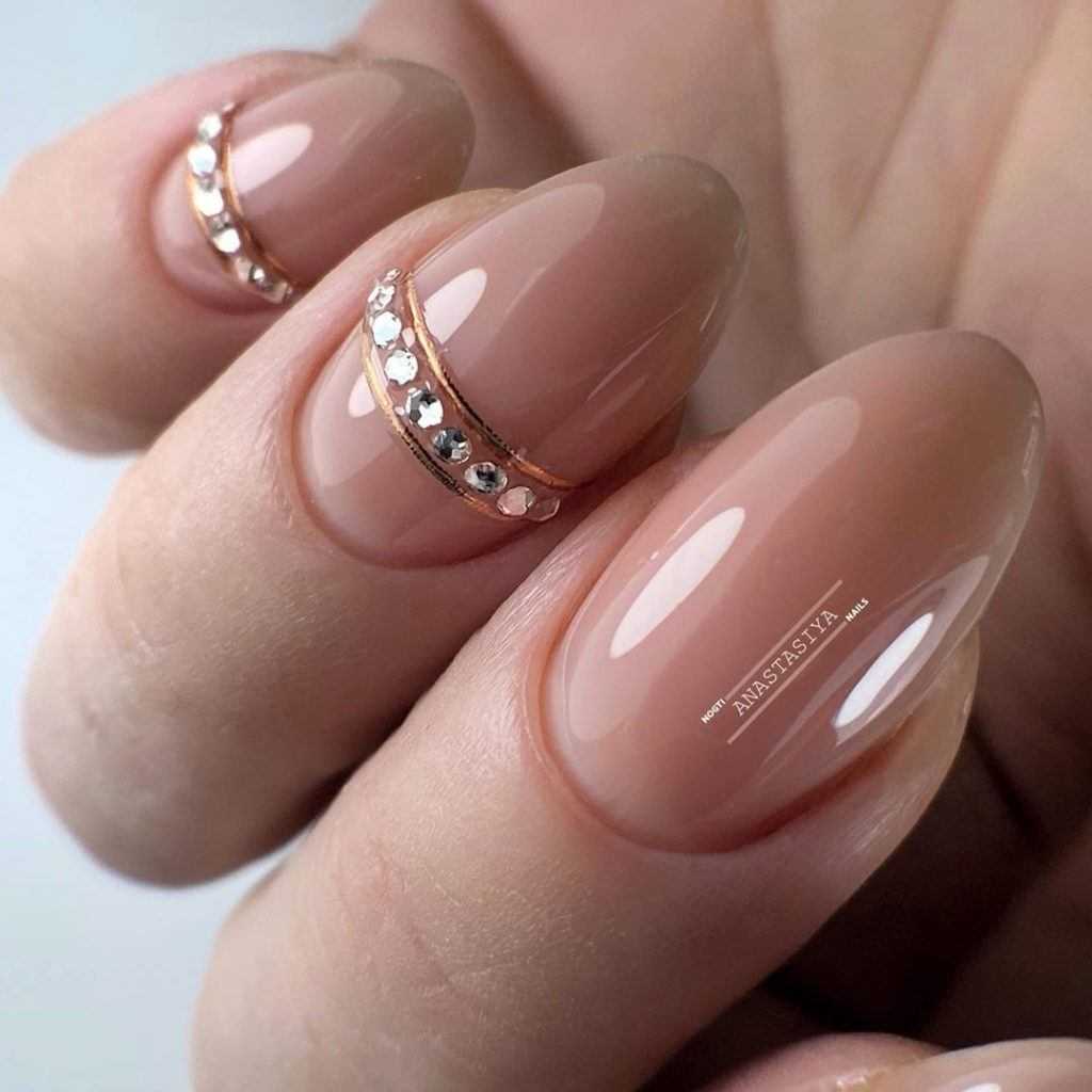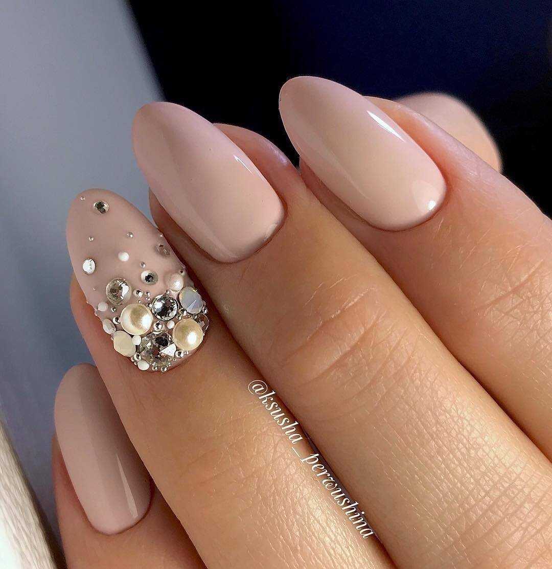 Если вам по душе более нежные и лаконичные вариации маникюра, то стоит обратить внимание на нюдовую палитру оттенков, которая чудесно сочетается на миндалевидных ногтях с блестящими дополнениями и актуальна в любой ситуации, вне зависимости от времени года за окном. Это может быть потрясающий нейл в стилистике нового года с блёстками и тематическими рисунками, миниатюрные бутоны, тонкие линии или изображения геометрического характера