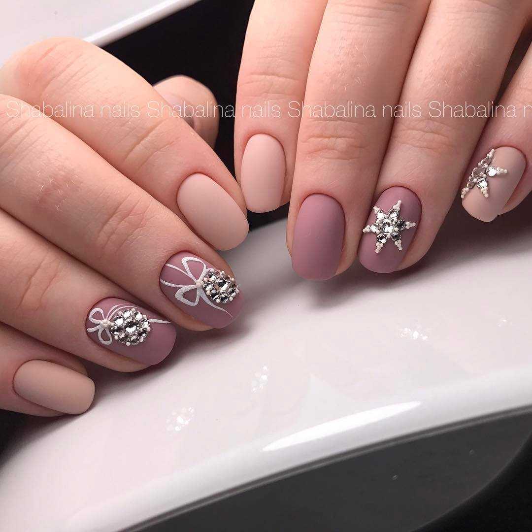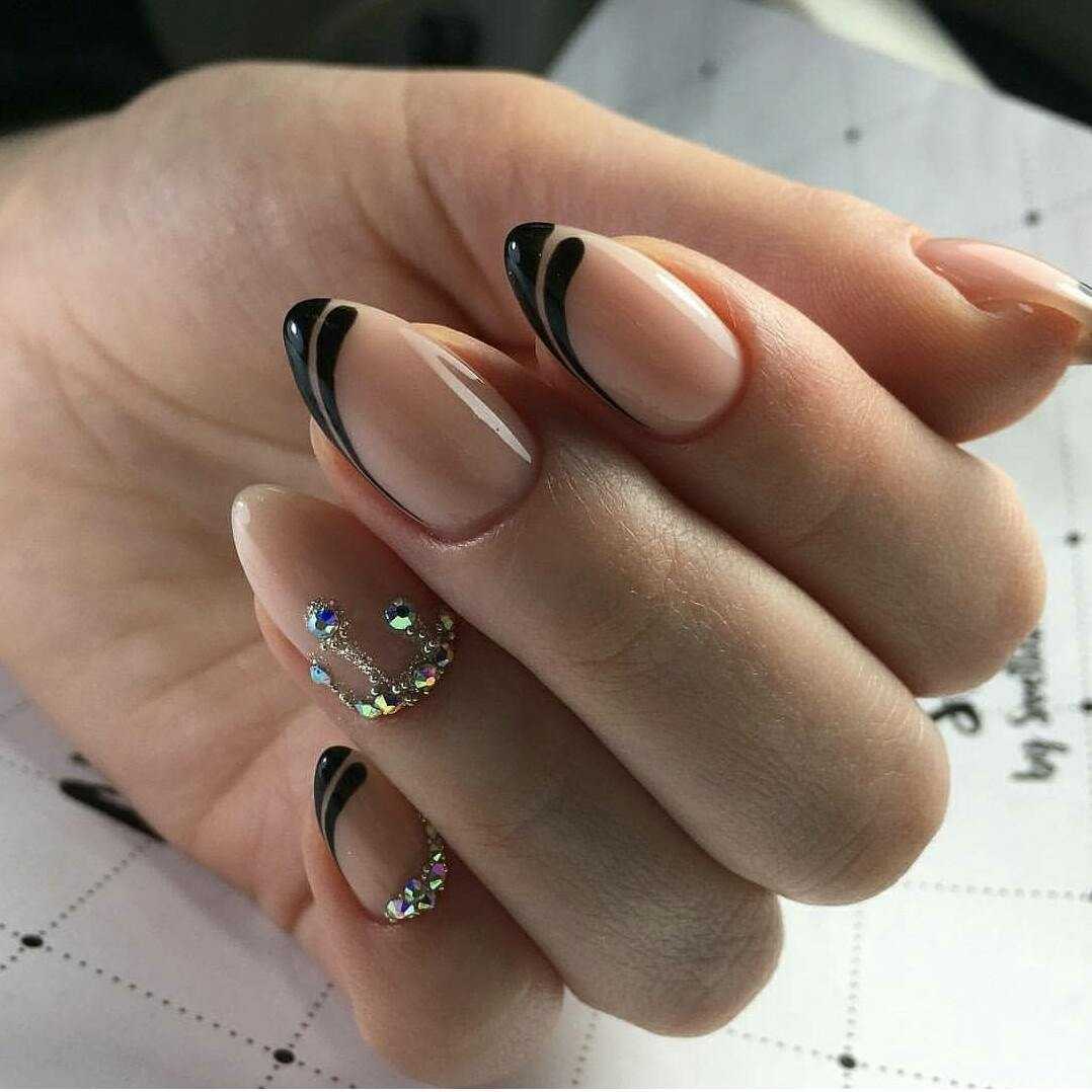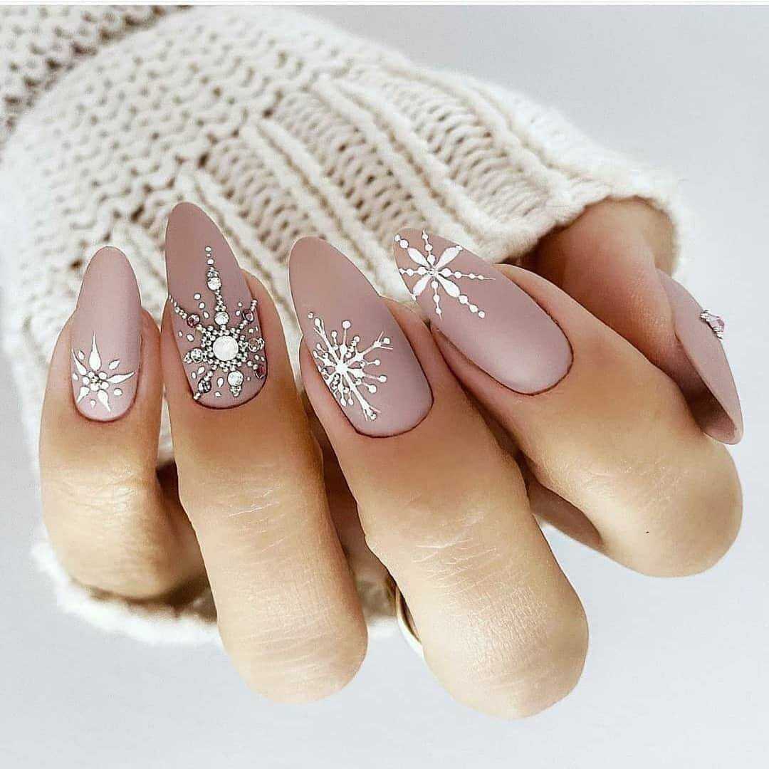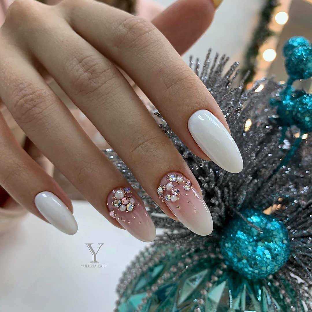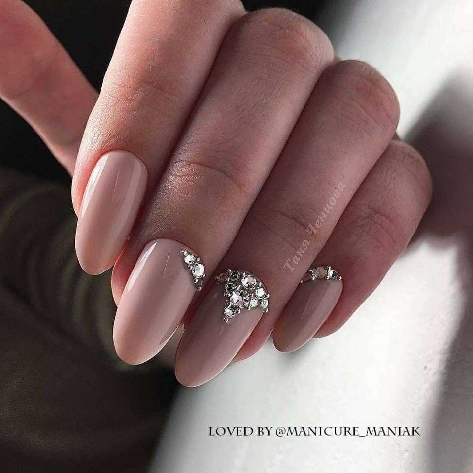 Если вам по душе более нежные и лаконичные вариации маникюра, то стоит обратить внимание на нюдовую палитру оттенков, которая чудесно сочетается на миндалевидных ногтях с блестящими дополнениями и актуальна в любой ситуации, вне зависимости от времени года за окном. Это может быть потрясающий нейл в стилистике нового года с блёстками и тематическими рисунками, миниатюрные бутоны, тонкие линии или изображения геометрического характера