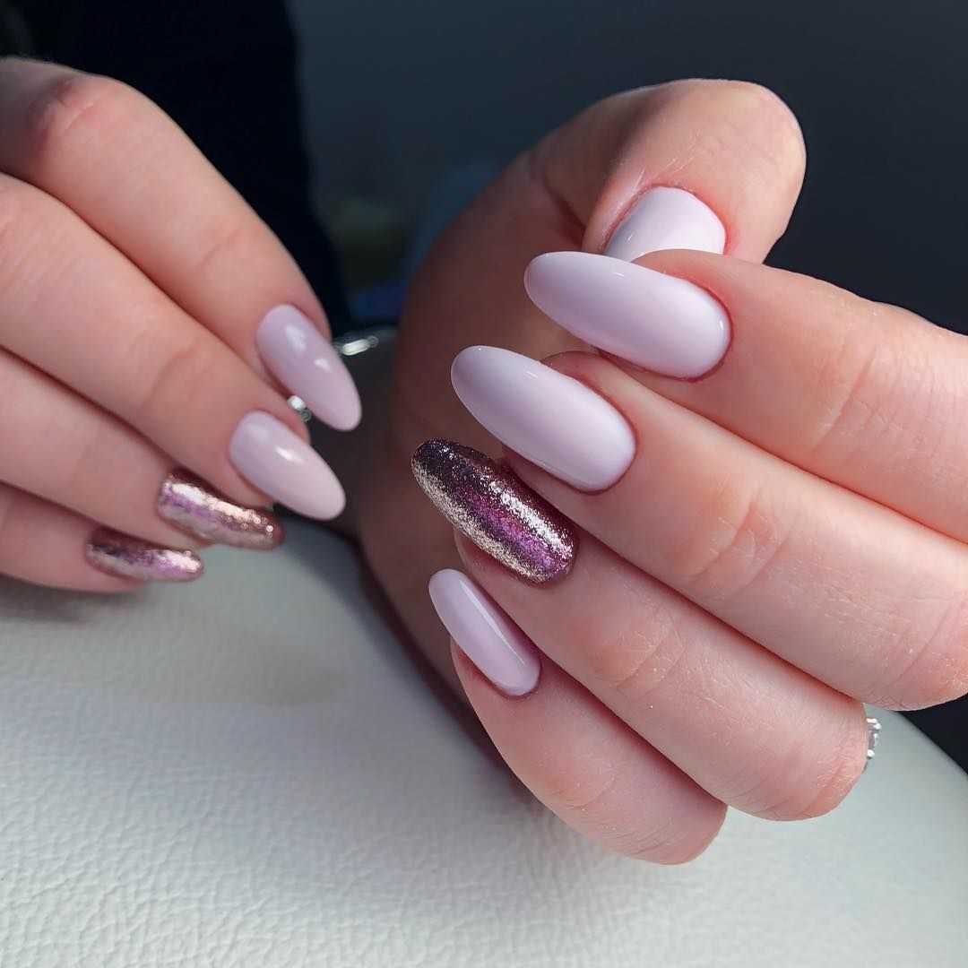 Романтичные натуры чаще остальных выбирают оформление ноготков в пастельных оттенках. Такое покрытие идеально смотрится на миндалевидной форме и всегда будет уместным. Кроме того, этот маникюр подойдет к любому образу, в том числе праздничному. Но если однотонное покрытие кажется вам слишком простым, смело дополняйте его рисунком. Это может быть изящный кружевной узор, мелкие цветочки, точечный или полосатый дизайн. Каждый из них смотрится по-своему интересно. В домашних условиях для этого можно использовать набор кистей, стемпинг или слайдер-дизайн. Это существенно ускорит процесс и лишь улучшит качество оформления ногтей.