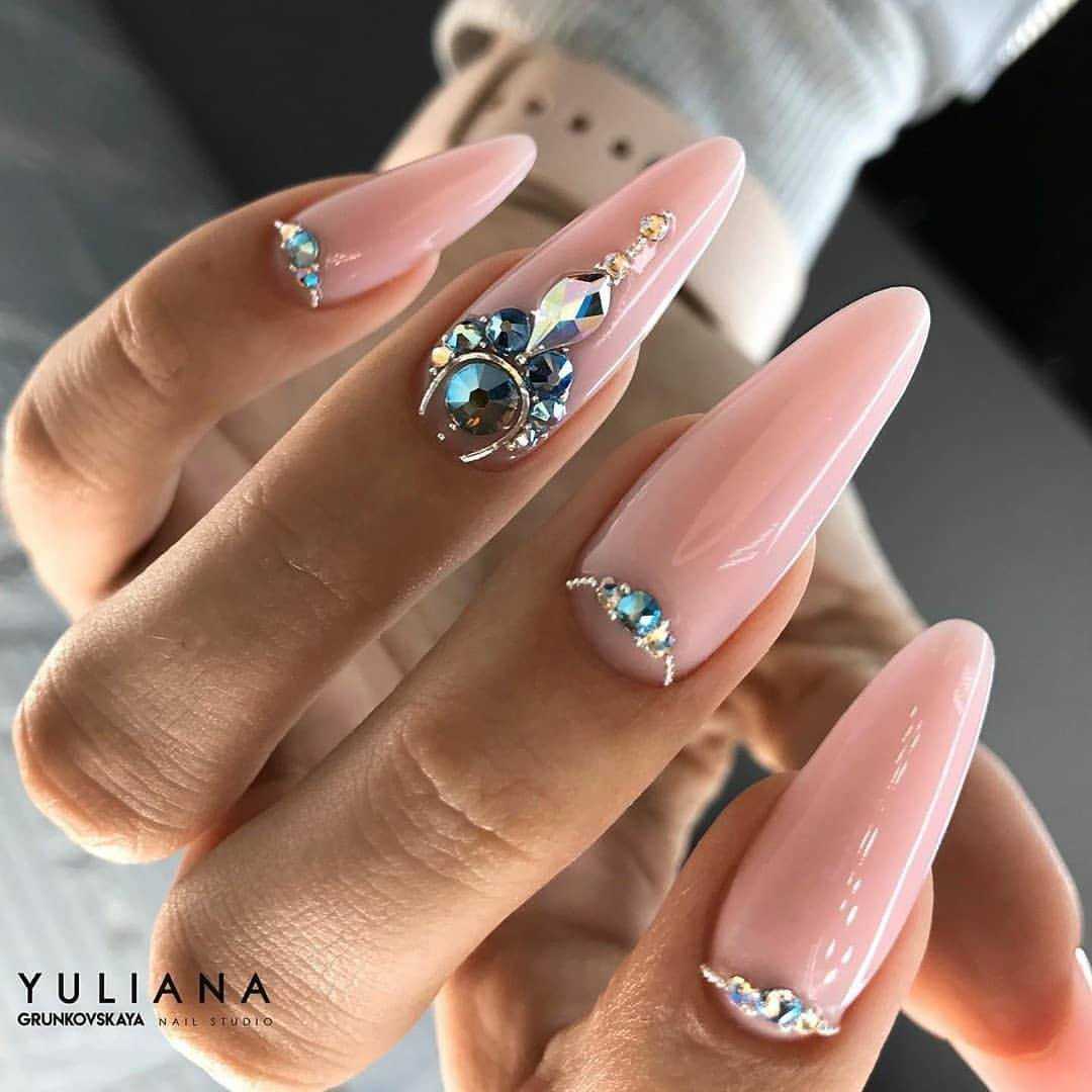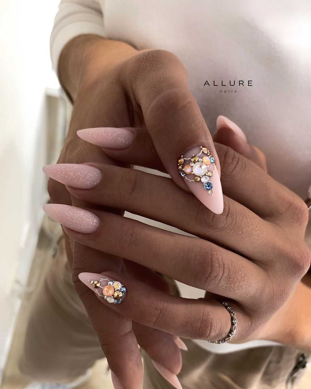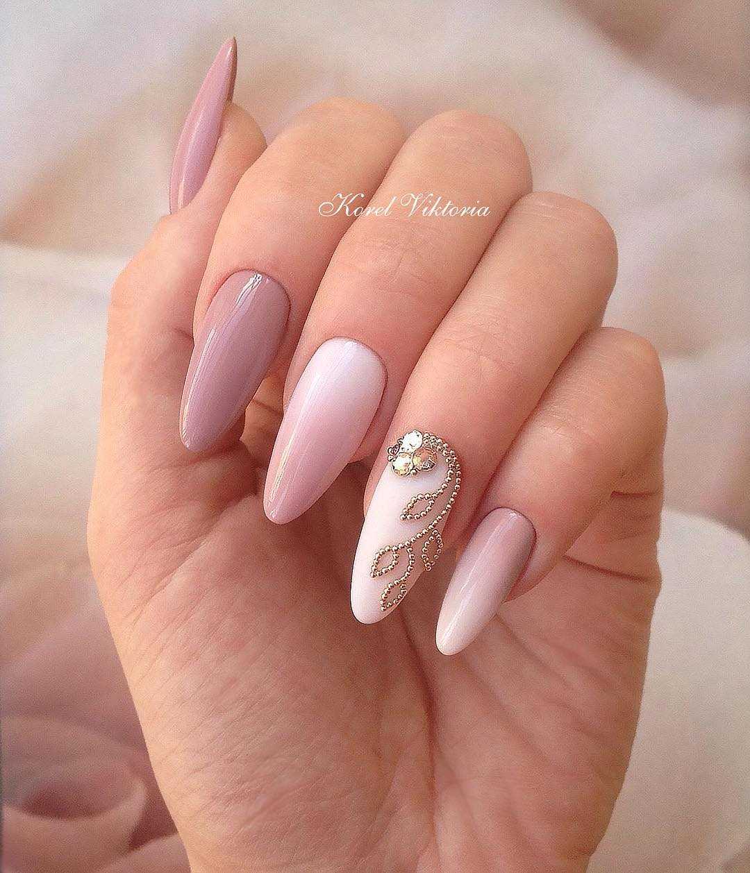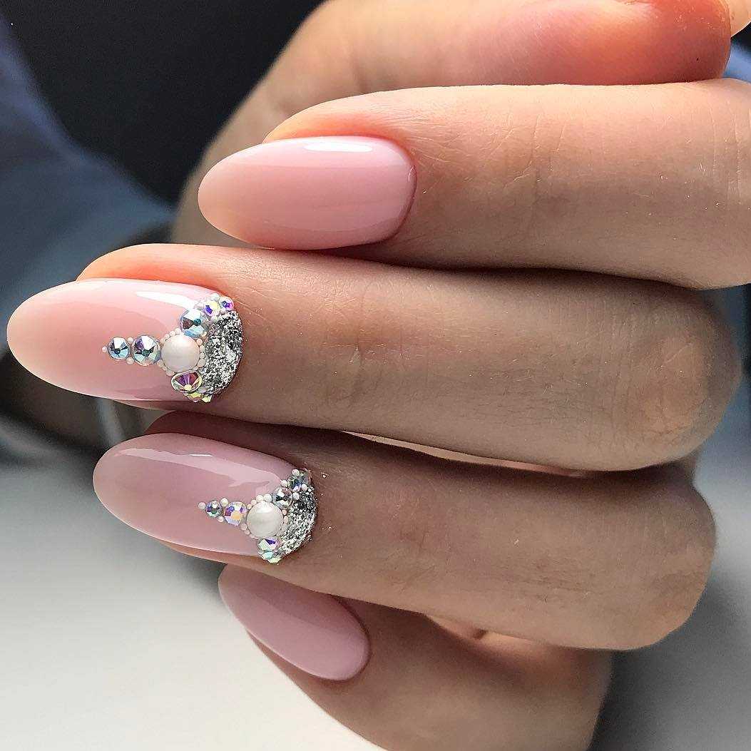 Несомненно, пастельный маникюр на миндалевидных ноготках может выступать в качестве вечернего оформления. В таком случае его стоит дополнить фольгированными оттисками, блестками, небольшим количеством страз или пудрой. В некоторых случаях нейл-мастера делают лепку. Но учитывайте, что данный вид декора сложный и в большом количестве может выглядеть неуместно. Поэтому лучше доверять это дело профессионалам.