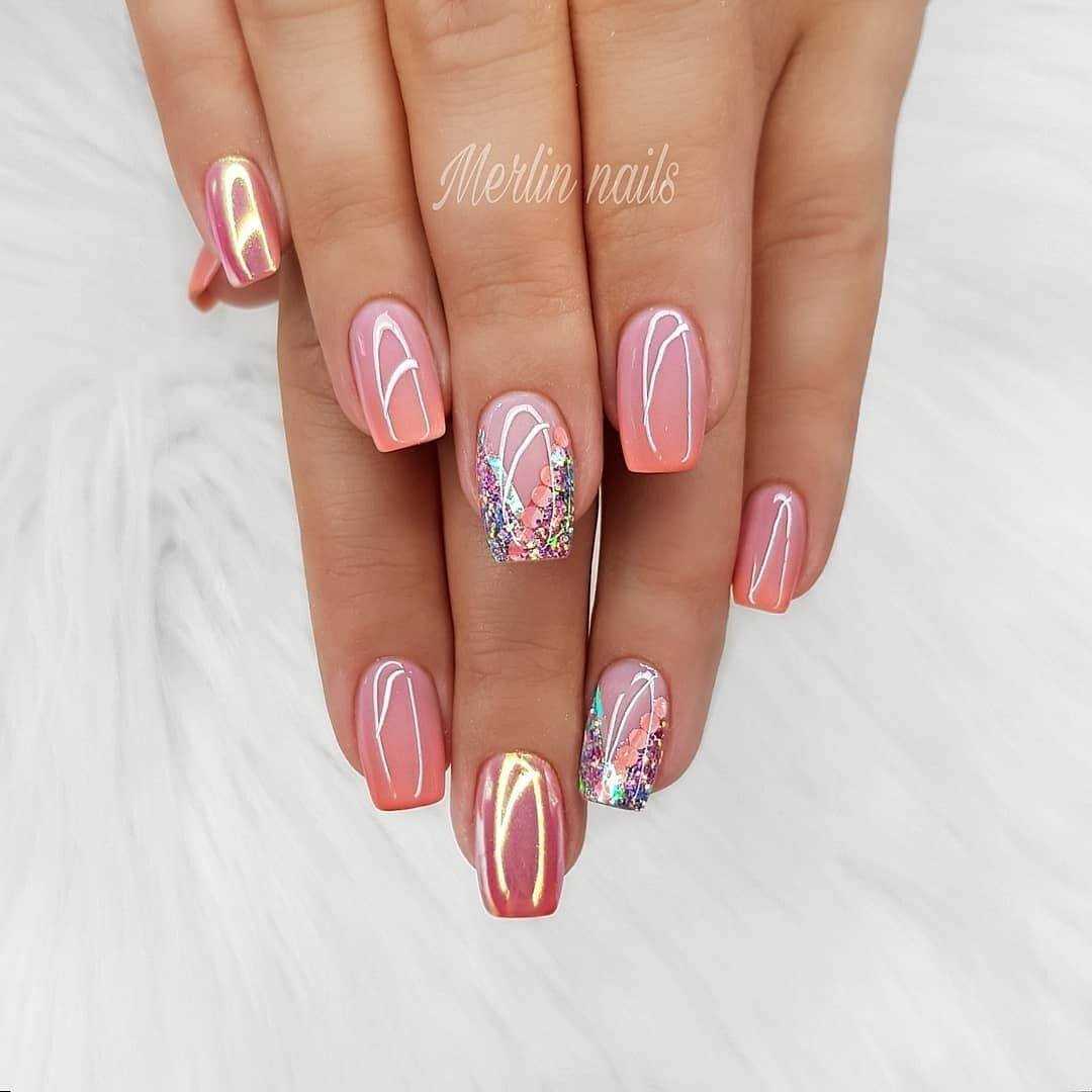 Не менее интересно смотрятся на нюдовой основе блестящая растяжка и полоски на кончиках ноготков в виде френча, завораживающие мраморные узоры, техника дотс с блестящими вкраплениями и многие другие идеи. Любое решение смотрится невероятно нежно и станет прекрасным завершением сдержанного делового образа или воздушного, романтического лука.