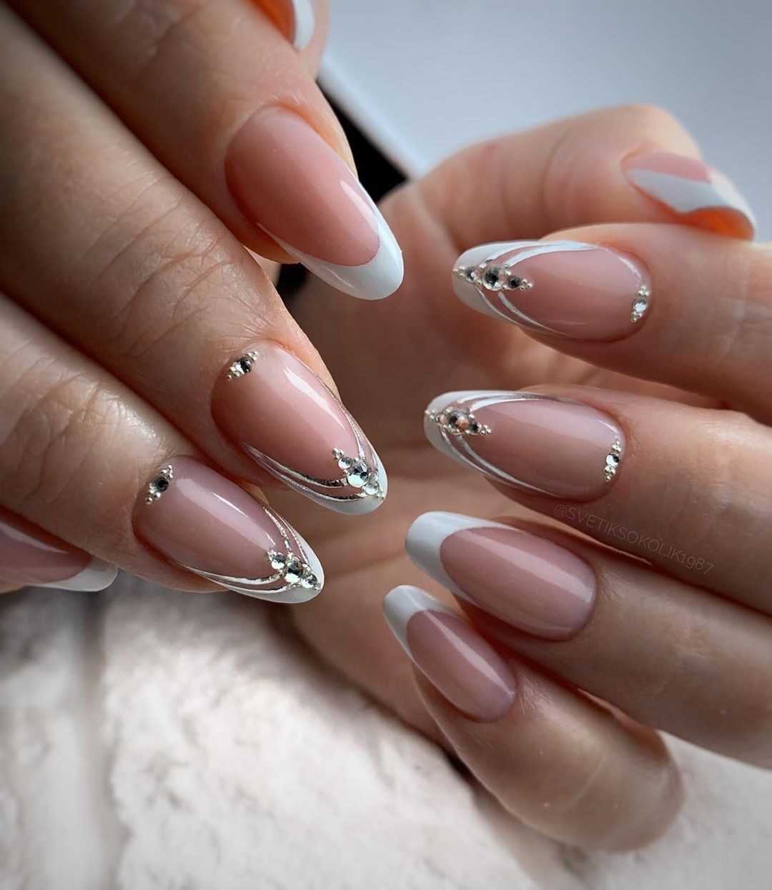 Сочетание нежного и очаровательного френча и таких же округлых утонченных миндальных ноготков, пожалуй, идеально и неимоверно гармонично. Самым минималистичным, универсальным и лаконичным будет классический френч с белой луной на пастельной основе. Такой маникюр для женщин с прекрасным вкусом подойдет для любого образа, уместен для повседневной жизни. Добавив несколько стразинок, получим более торжественный вариант.