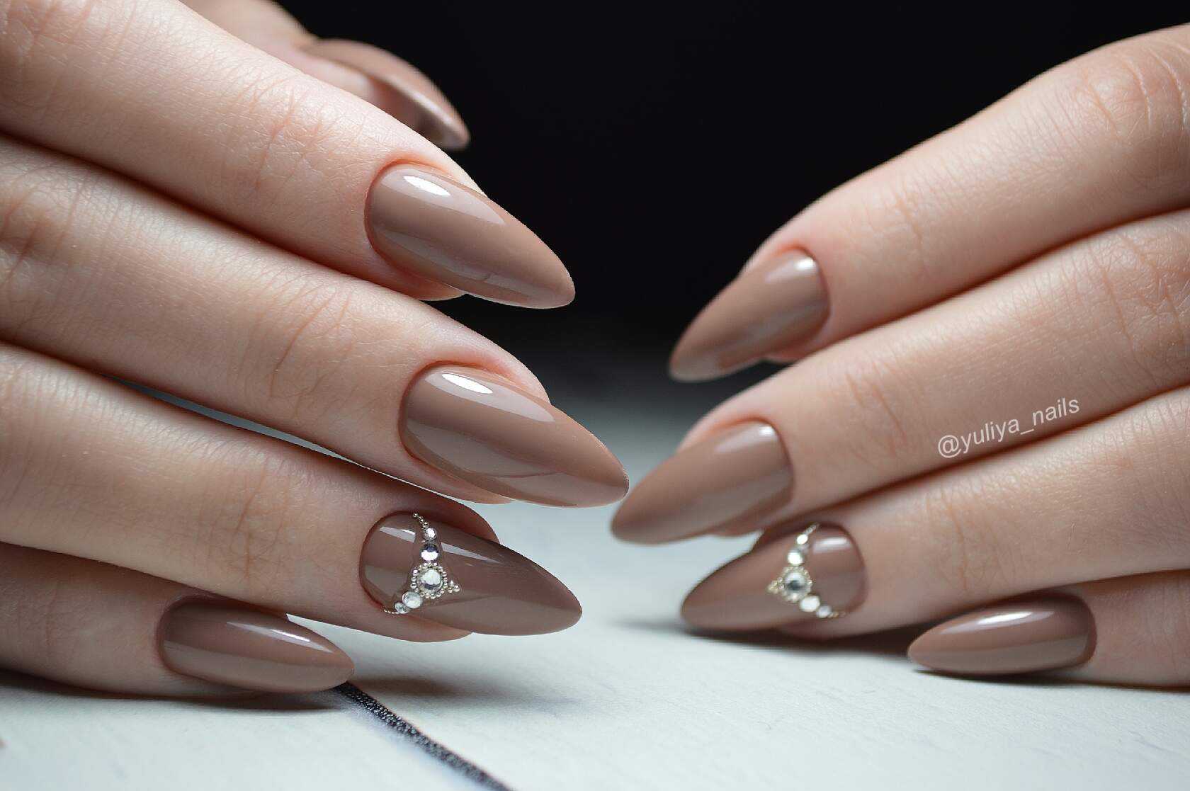 Стразы, блестка или фольга — отличное дополнение для любых оттенков коричневого. Такой маникюр удивит как ваших старых друзей, так и новых знакомых — пользуйтесь этим преимуществом.