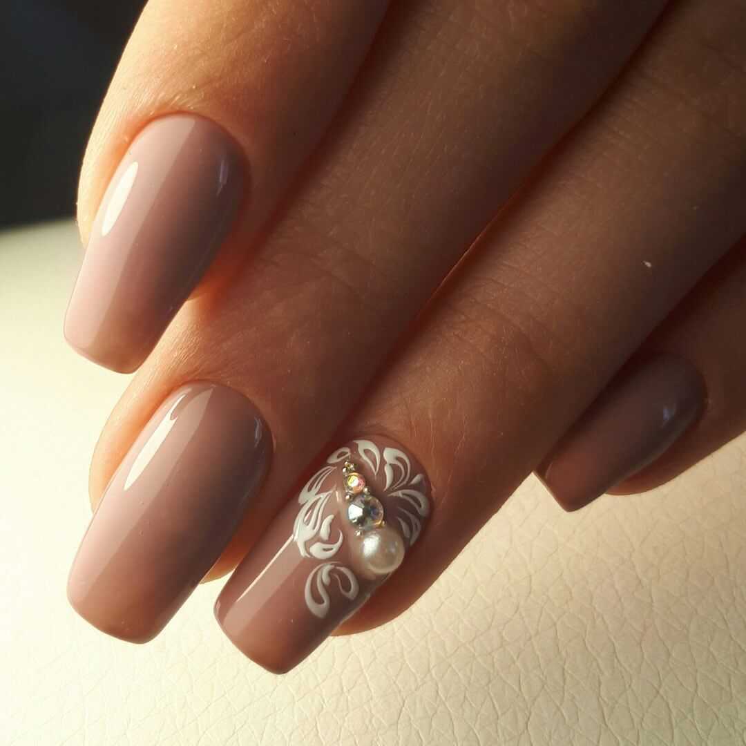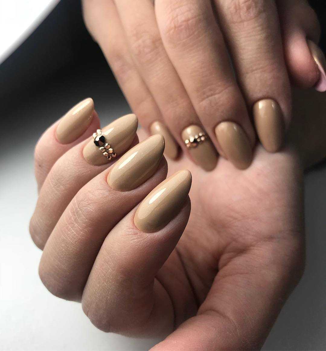 Для создания нежного нейл-арта рекомендуется использовать светлые оттенки коричневого цвета — например, бежевый, терракотовый, карамельный. Декоративных элементов должно быть по минимуму.