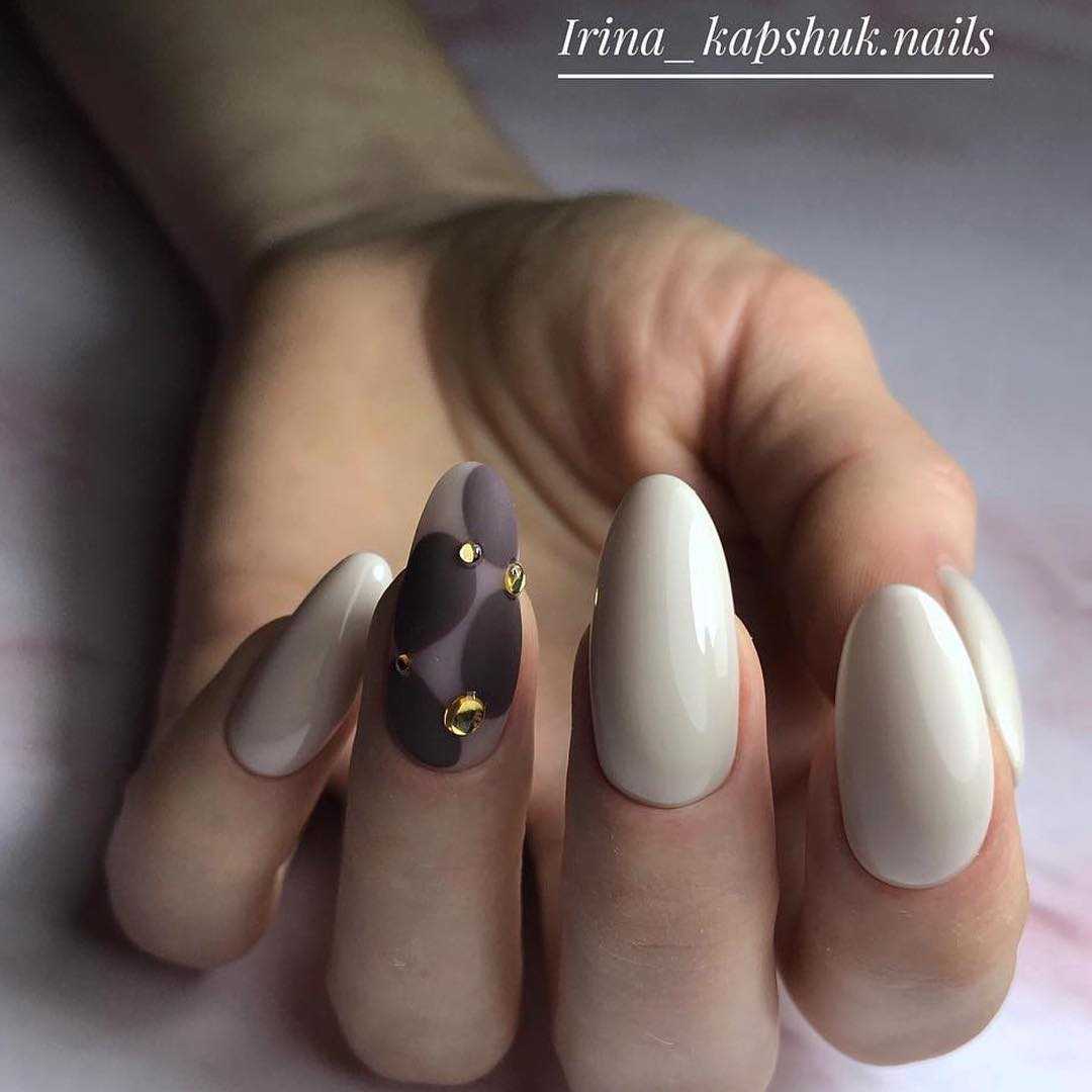 В тренде остаются мраморные текстуры на миндальных ногтях, в светлых оттенках они особенно красивы. Но также их делают зелеными, черными, вишневыми. Вкрапления золотистой или серебристой потали придают мрамору более драгоценный вид.