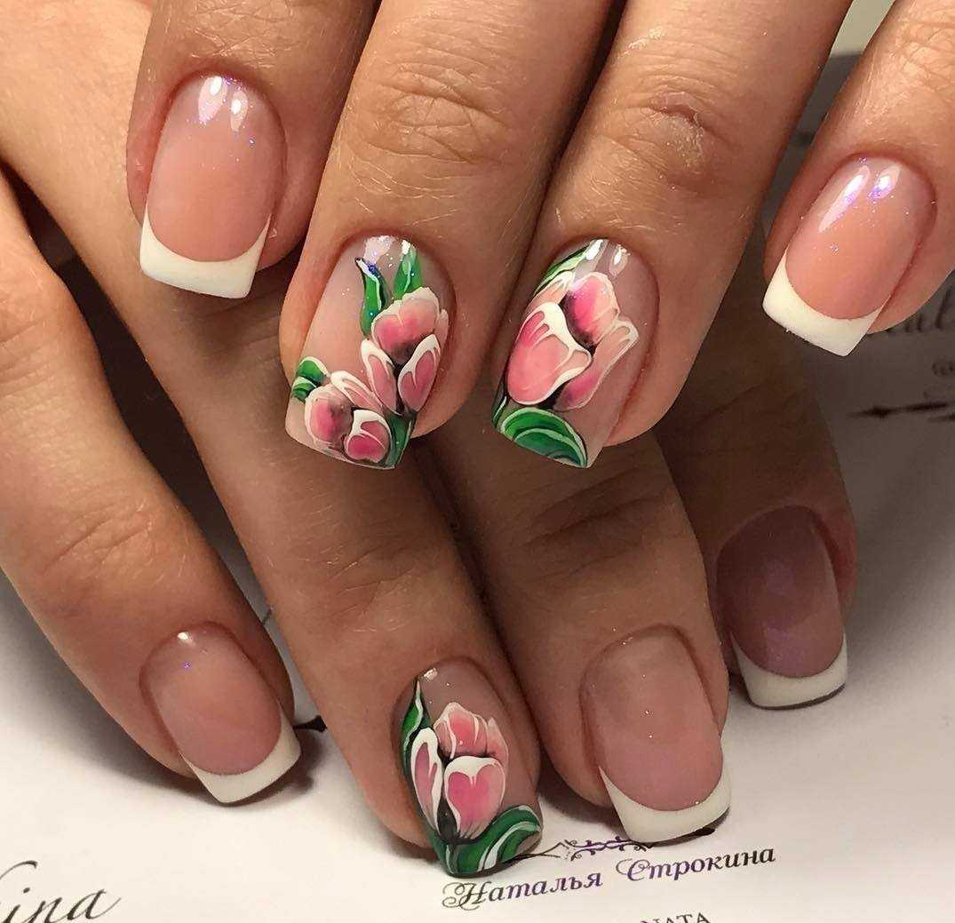 Красивый дизайн можно создать при помощи рисунков цветов. Такой френч выглядит женственно и нежно. Его из года в год выбирают женщины всех возрастов и статусов. Лето 2022 года не может пройти без такого оформления ногтей.