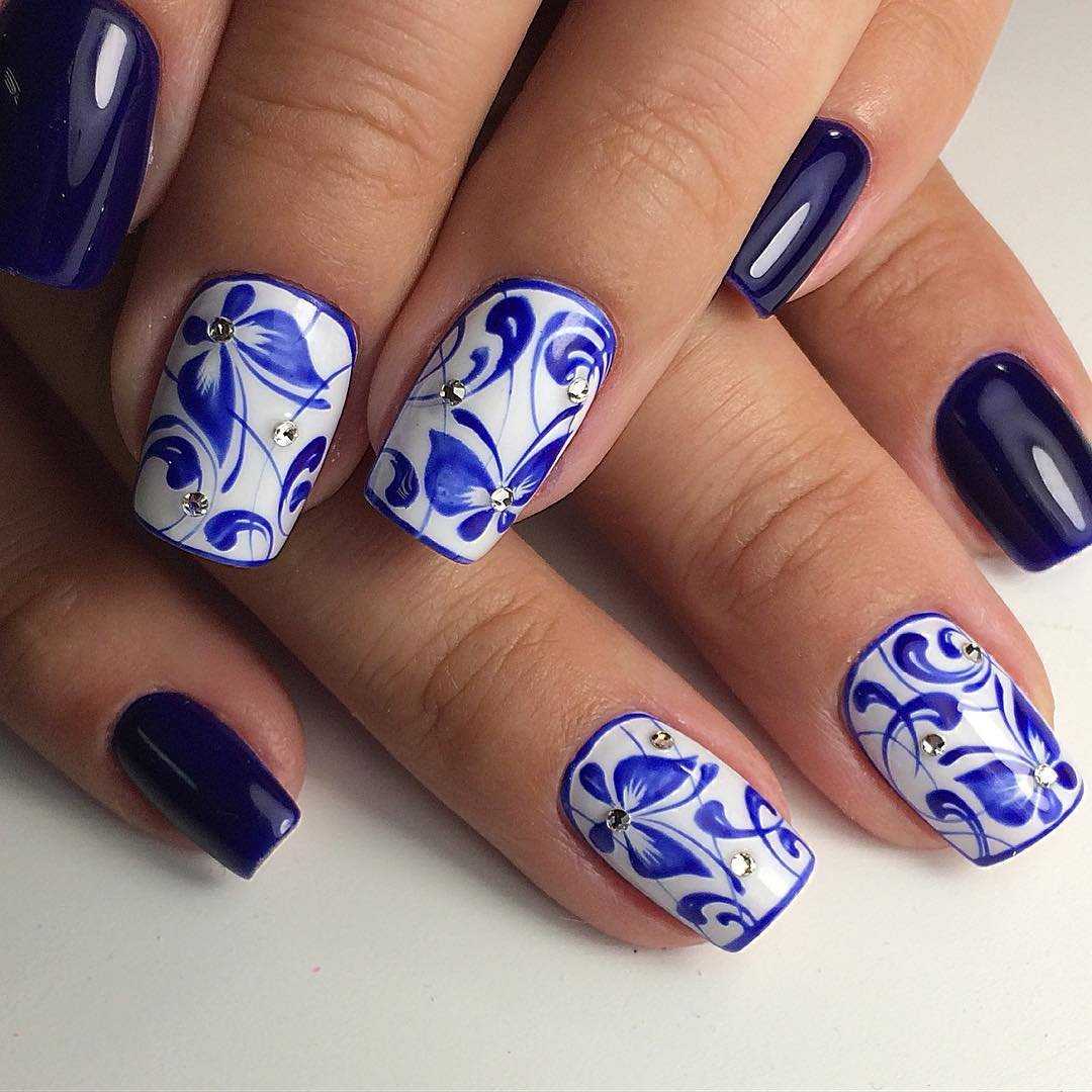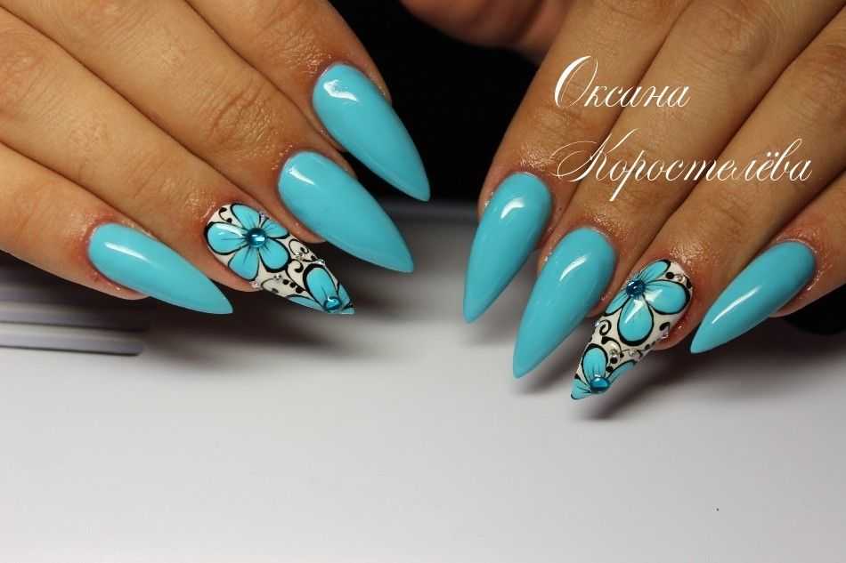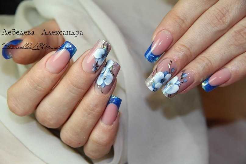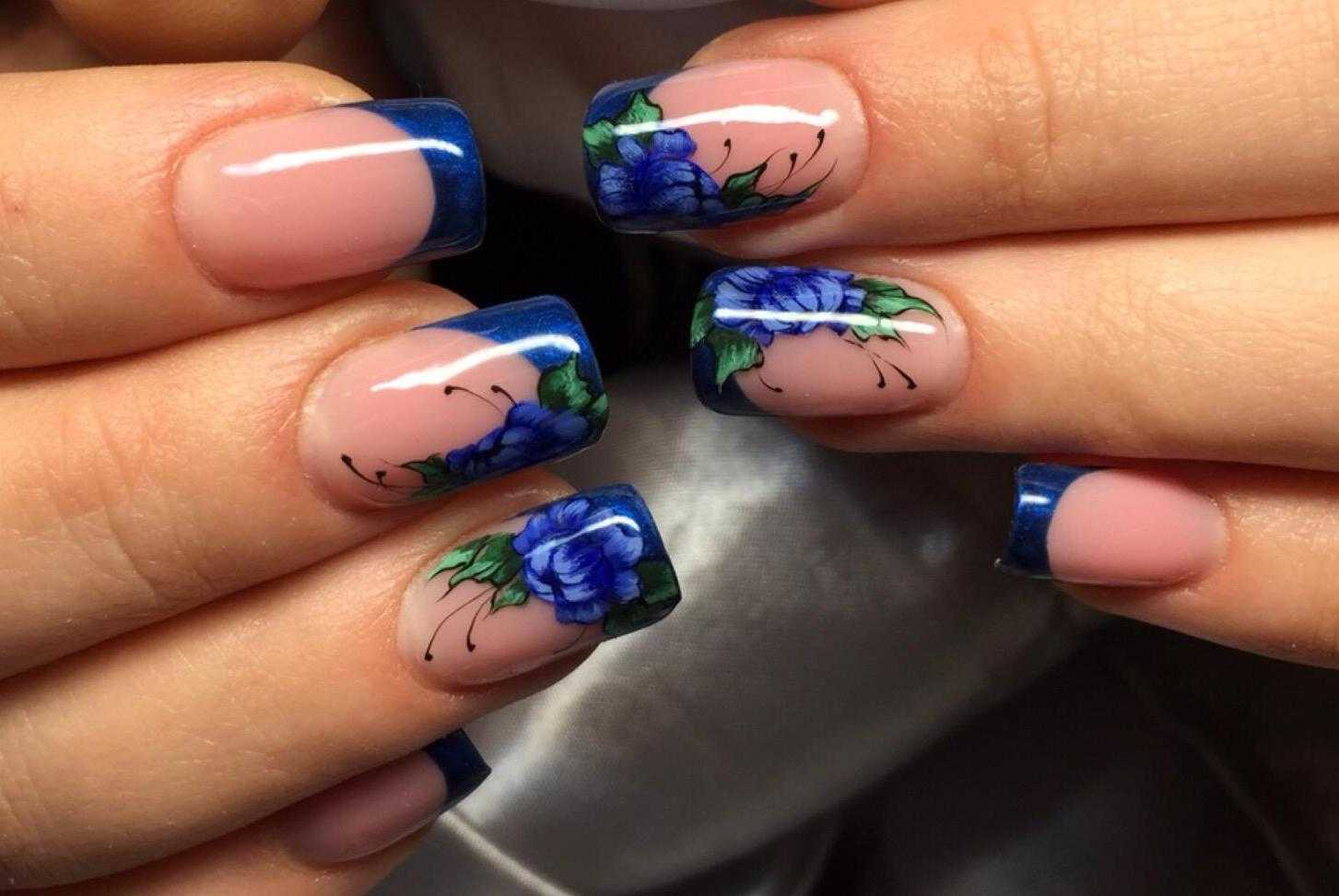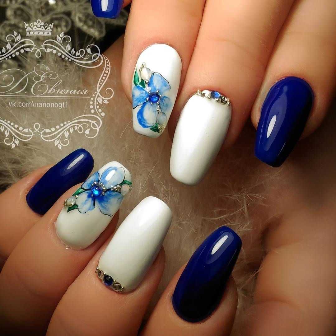 Эффектные, утонченные и изящные длинные ноготки, украшенные удивительными цветочными рисунками синего цвета, выглядят обворожительно и непревзойденно. На данной длине можете смело выполнять различные цветочные композиции. Не стоит исключать комбинирование с другими техниками. Такой маникюр будет выглядеть более роскошно и необычно. В качестве декора используйте блестки, акриловую пудру, бусинки и многое другое.