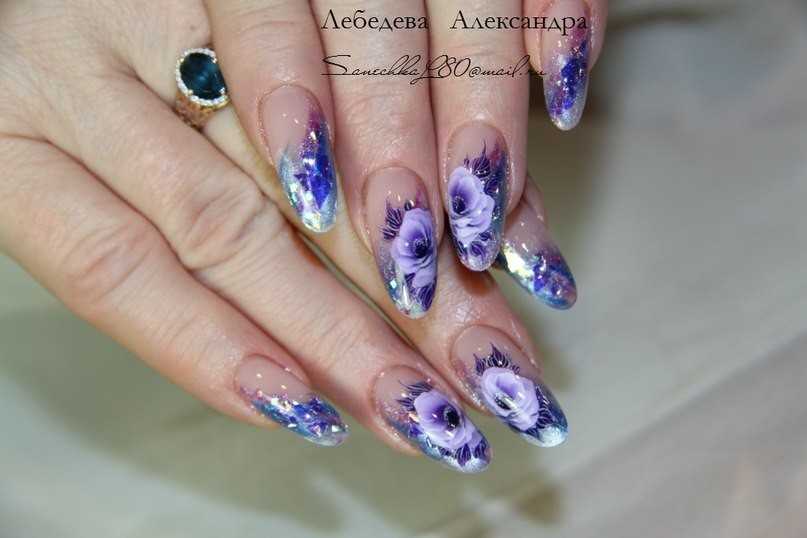 Синий — цвет, который поучаствовал в образовании оттенков фиолетовой гаммы. А значит он отлично подойдет для сочетания с сиреневым. Здесь отлично смотрится геометрический дизайн, градиент — вертикальный и горизонтальный, кошачий глаз, сочетание с синима хлопьями юкки на сиреневом фоне, втирка.