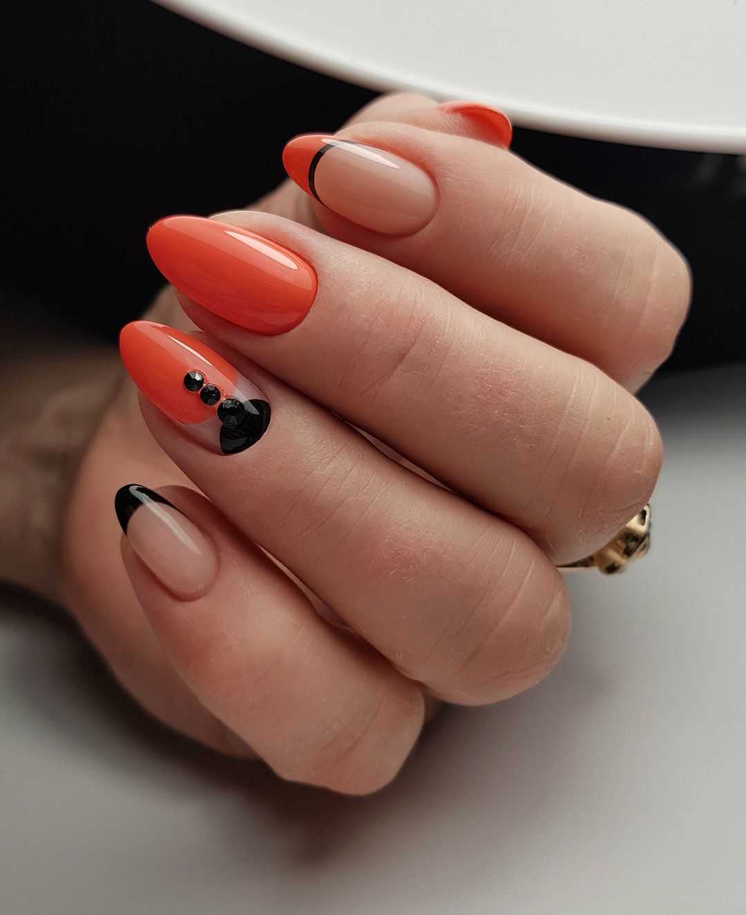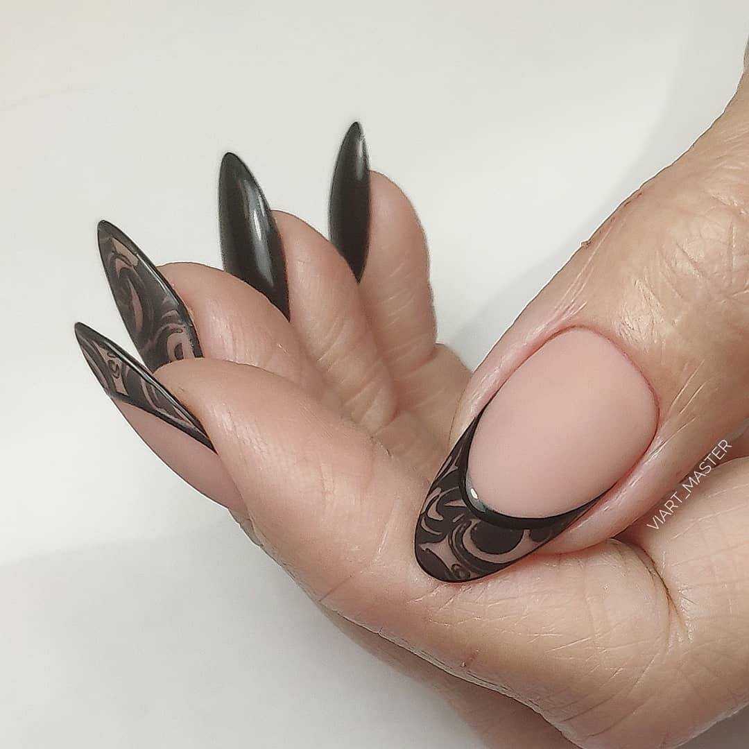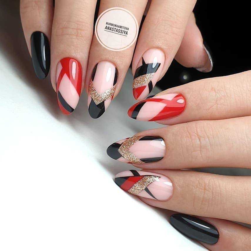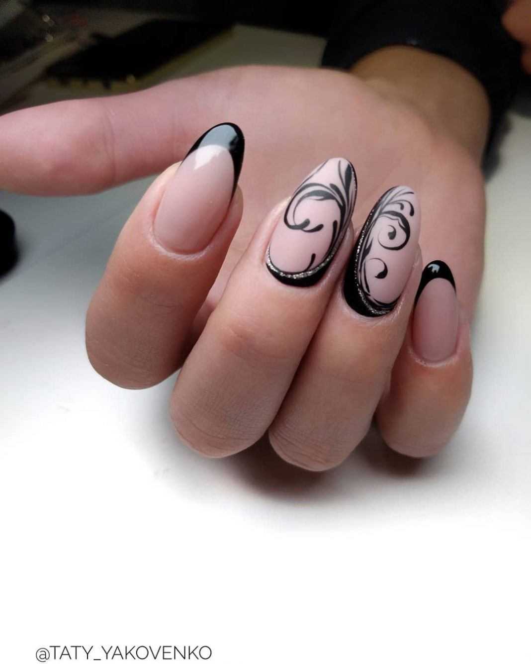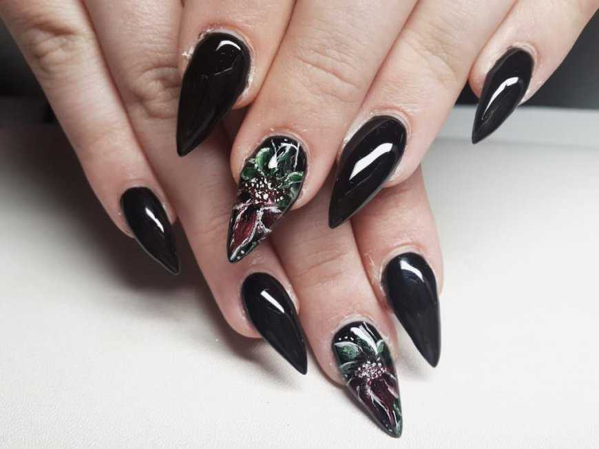 Шикарным дополнением миндального маникюра станет черный гель-лак. Используйте его для прорисовки кружевного декора, абстракции и флористики. Также не лишними будут стразы и камни в серебряном или черном цвете, аккуратно расположившиеся в прикорневой зоне. С помощью красного цвета на ногтях можно выполнить великолепные бутоны роз. Используйте для дизайна специальный витражный гель-лак, который позволит создать объемный аквариумный эффект.