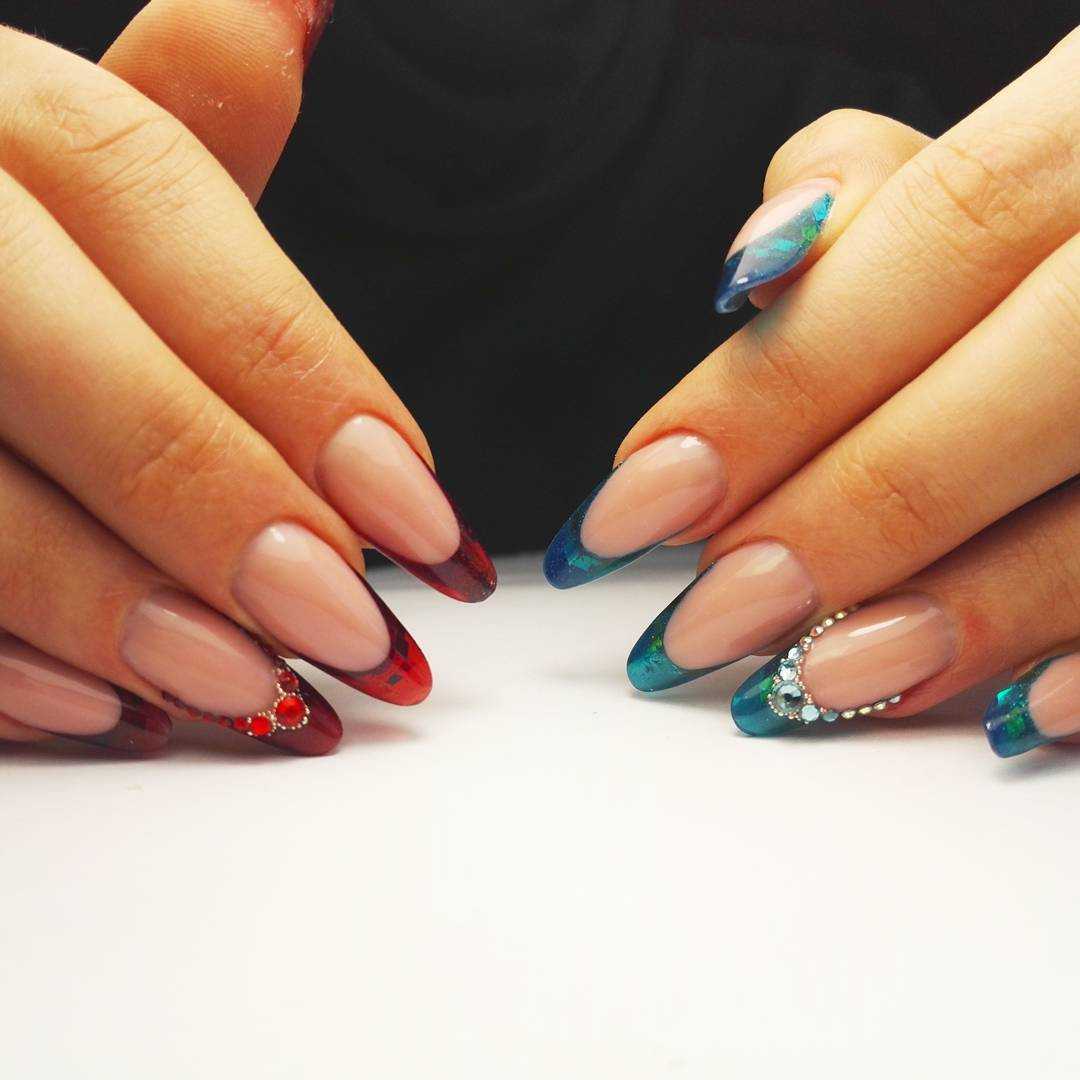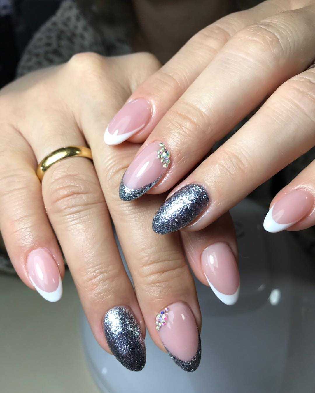 • декор со стразами – разделённая серединной выкладкой из белых камней на чёрном фоне, усеянная в диагональной плоскости поверхность ногтевой пластины или вообще полностью покрытое стразами ногтевое ложе – в любой манере расположения разнокалиберных светлых камней на тёмном фоне подобный миндальный маникюр будет смотреться просто блестяще. Здесь можно играть с цветами и менять, например, основу с тёмной на светлую, а стразы при этом с белых на чёрные. Эффект в любом случае будет потрясающим;• битое стекло – ещё один будоражащий сознание маникюр, завораживающий магическим мерцанием имитированных осколков серебряного или золотого стекла из фольги на глянцевом чёрном базовом покрытии;• парчовый френч – удивительная тенденция к оформлению объёмной росписи на матовой поверхности миндалевидных ноготков в дорогих аристократических расцветках смотрится особенно нарядно. Обрамлённая выпуклыми парчовыми вензелями улыбка французского маникюра выглядит довольно презентабельно и буржуазно.