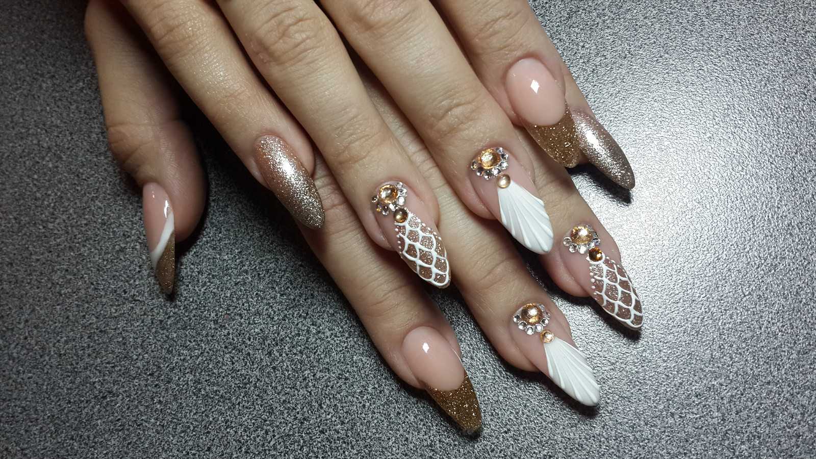 • белоснежный дизайн с жемчугом – белый цвет, олицетворяющий чистоту, свежесть, опрятность и благородство, как нельзя кстати смотрится на миндальной ногтевой пластине. Общую эстетическую красоту образа завершает россыпь разнокалиберного жемчуга по всем ноготкам или лишь отдельным его участкам; подобного рода дизайн подойдёт не только по особому случаю, где требуется выдерживать элегантный внешний вид, но также будет уместен на торжественном свадебном мероприятии;• серединная пиковая грань – очень часто современный нейл-арт включает в себя создание на заранее прокрашенной однотоном поверхности ногтя серединную пикообразную геометрическую форму, расширенную у прикорневой зоны и сужающуюся к линии среза. Очень гармонично смотрится подобного рода акцент, выполненный в серебре на базе холодного оттенка или в золоте в случае использования тёплых тонов основного покрытия;• расписной дизайн – нынче довольно модно осуществлять на одном или нескольких отдельных ноготках абстракцию с рисунком в виде ярких чёрных вензелей на восточный манер поверх светлой основы. За счёт контраста и игры противоположностей в качестве цветовых решений данный дизайн смотрится аристократично и фешенебельно.