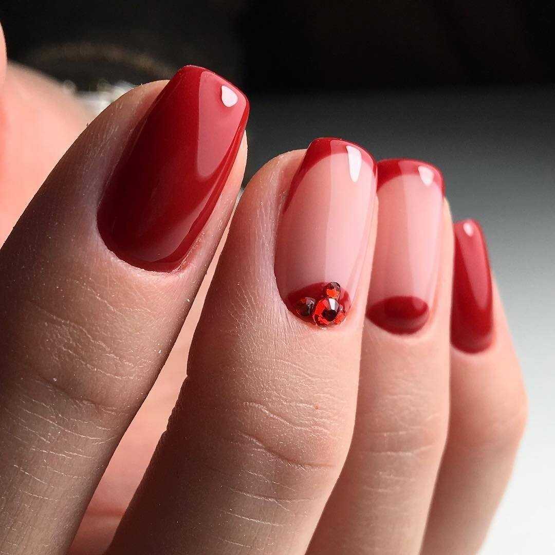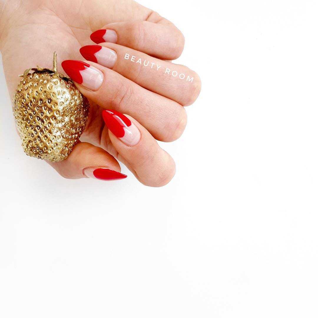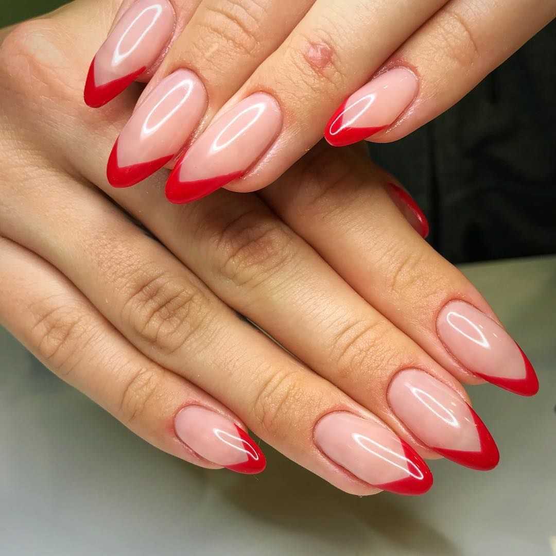 Миндальный и красный – на первый взгляд совершенно не сочетаемые оттенки, однако, в одном нейл-арте смотрятся невероятно стильно и красиво. С помощью этих оттенков профессиональные мастера создают потрясающий французский дизайн. При этом край ногтя окрашивается красным оттенком, а миндальным – остальное пространство ногтевой пластины.