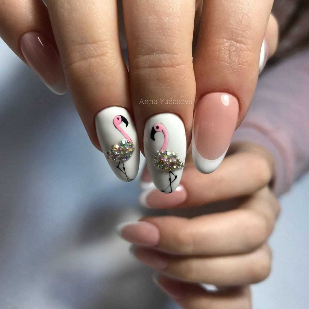 еще один способ подчеркнуть королевскую миндальную форму — использовать в роли акцента рисунок. Накладные цветы с акриловой пудрой, бабочки, веточки и мультяшки — любой из этих вариантов актуален для длинных миндальных ногтей. Только помните, что шеллак, используемый для неил-арта, должен быть плотным и нетекучим;