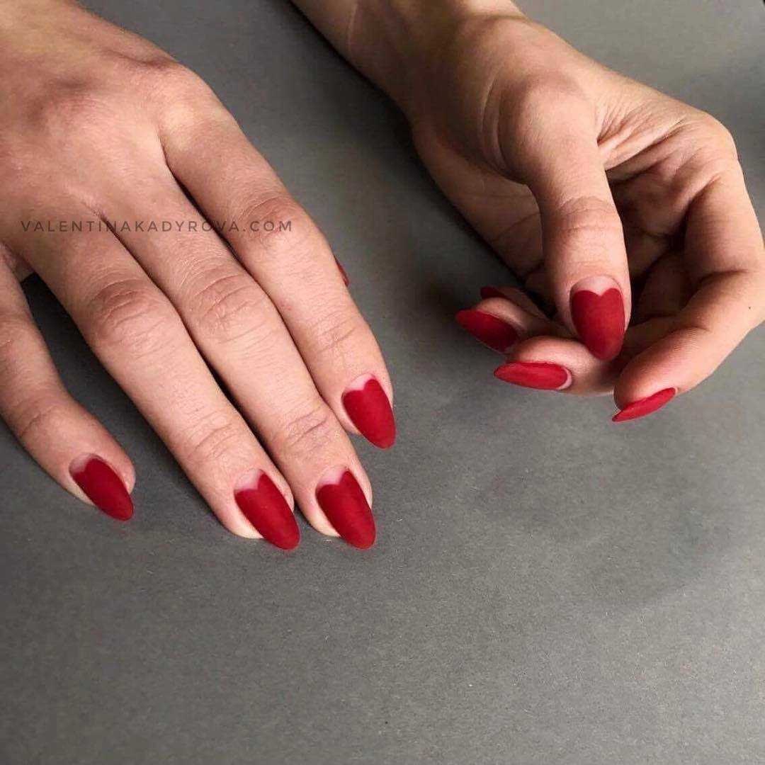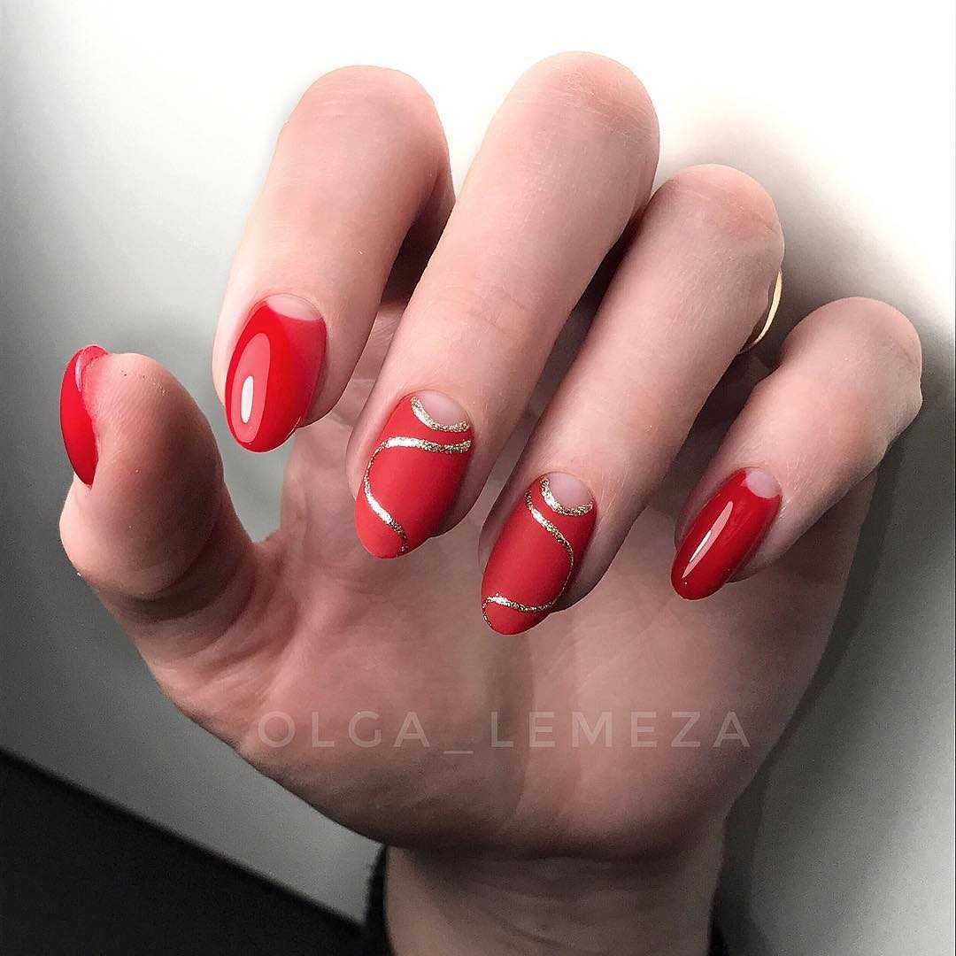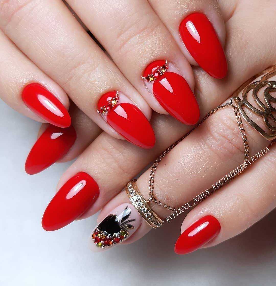 Красный маникюр на миндалевидной форме всегда хорош. Его можно украсить камешками или тонкими линиями. Следите за тем, чтобы цветовая гамма хорошо сочеталась с аксессуарами в вашем наряде.