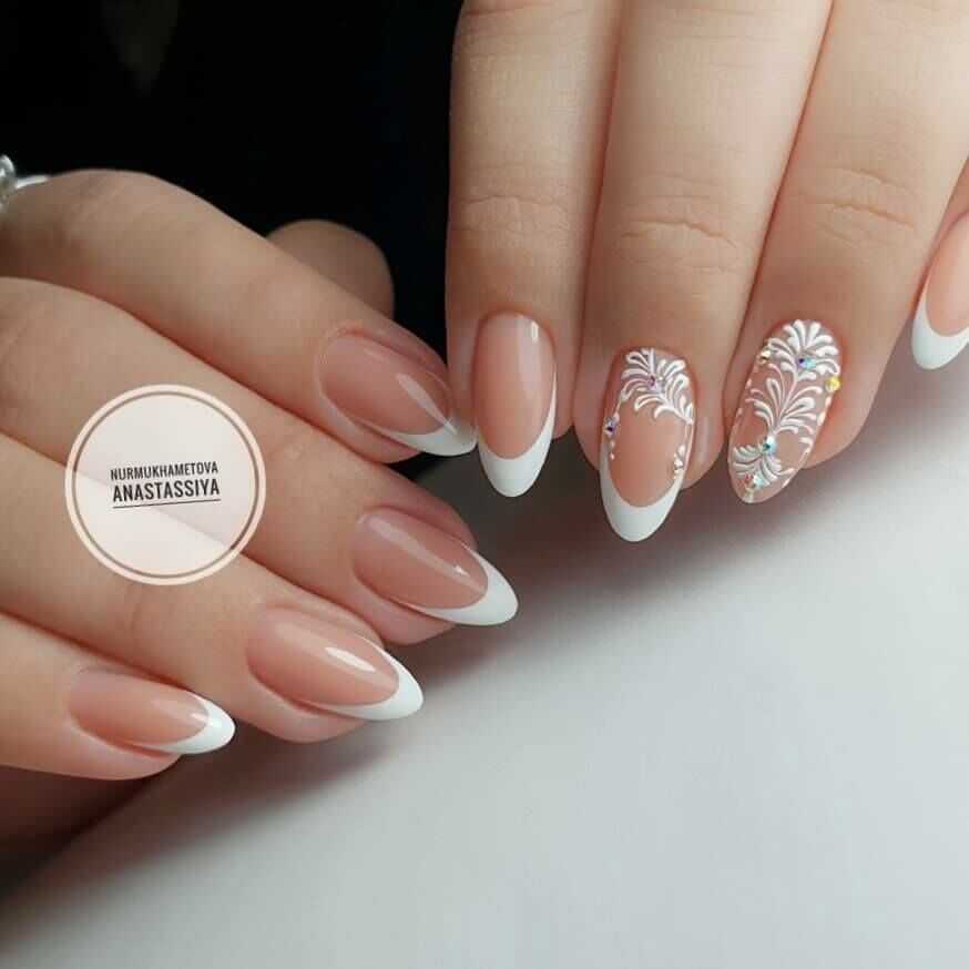 Френч на миндалевидных ногтях можно украсить рисунком в виде белоснежного ажурного кружева. Это вневременной стильный дизайн, который покоряет девушек своим нарядным и торжественным видом.