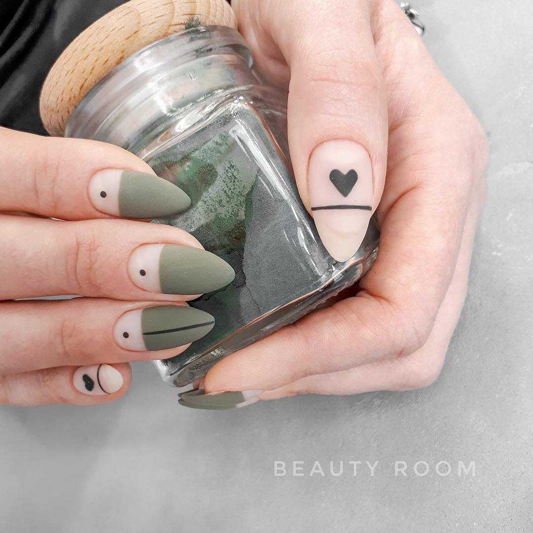 Миндальный цвет – отличное решение для фонового покрытия. Это нейтральный цвет, который может с легкостью гармонировать со светлыми тонами: белым, серым, розовым и другими тонами. На миндальном фоне лучше разместить дизайн минимализм с точками, полосками, color block`ами и другим несложным узором. Иногда достаточно пары тонких полосок, чтобы миндальный маникюр оживился и стал гораздо заметнее.