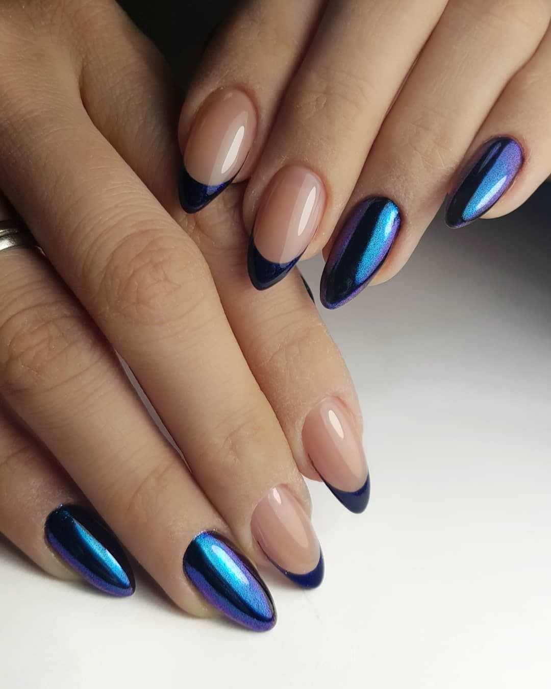 Сочетание разных видов покрытий. Матовый, зеркальный, глянцевый лак идеально украшает миндальную форму без дополнительных аксессуаров. На пике моды металлизированное покрытие.