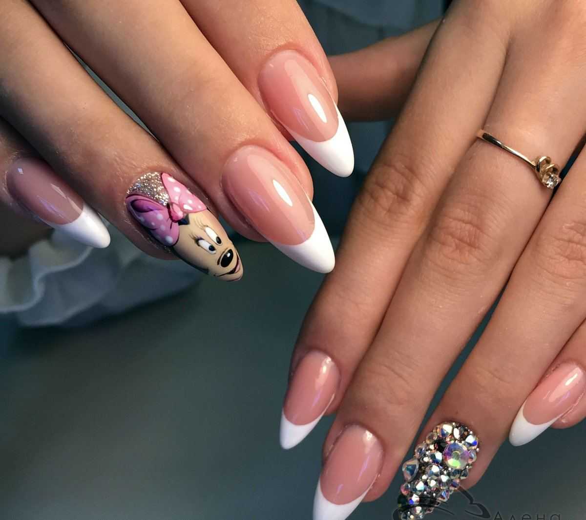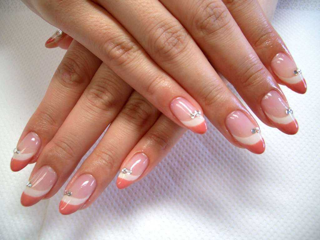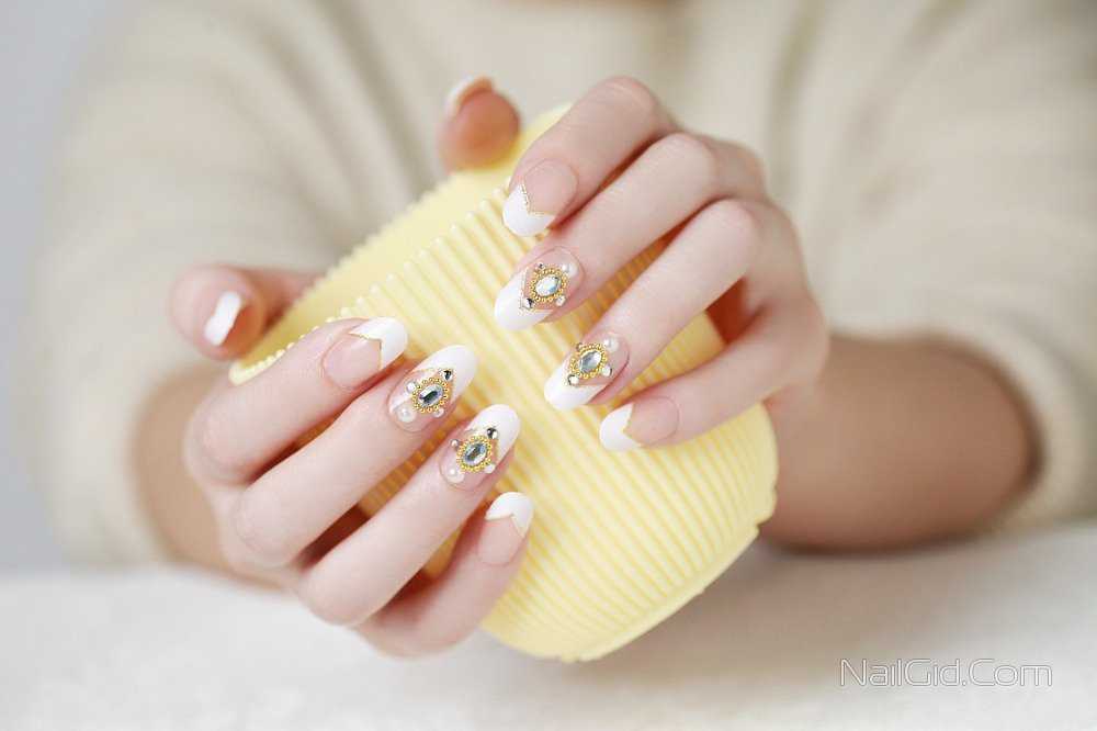 Красивый френч на миндалевидных ногтях: дизайн с камнями