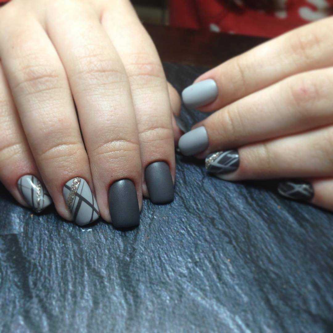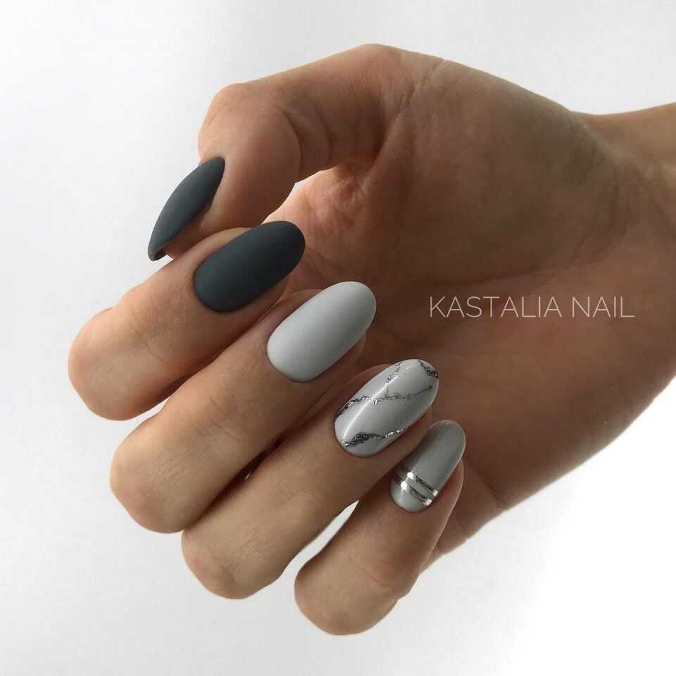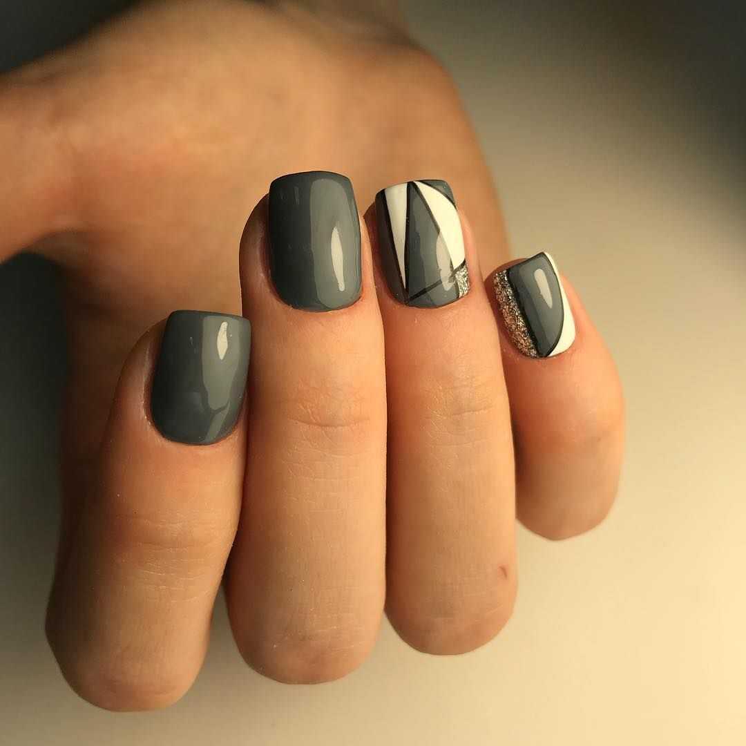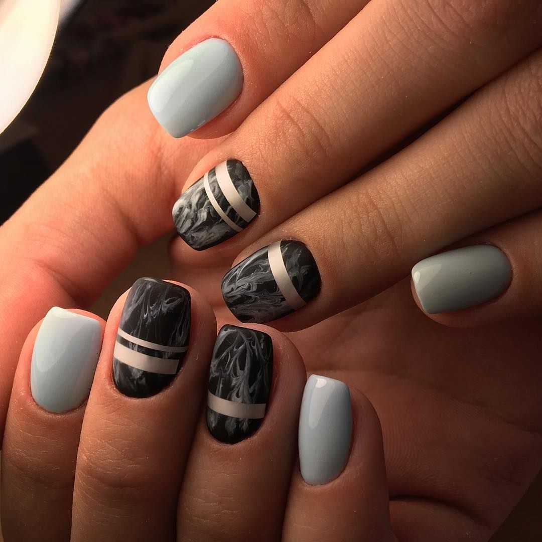 Серо-белый френч, минимализм или мраморный дизайн являются прямым тому подтверждением. Что касается компании серого и чёрного лаков, то в этом случае общая картина оформления отличается большей выразительностью и чёткостью. Чёрный позволяет серому выглядеть ярче, а серый, в свою очередь немного смягчает насыщенность чёрного. Контрастные рисунки с элементами стального блеска, ажурная вуаль на кончиках ногтевых пластин или геометрический принт будет украшать ваши пальчики – результат получается сногсшибательным.