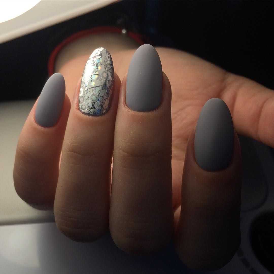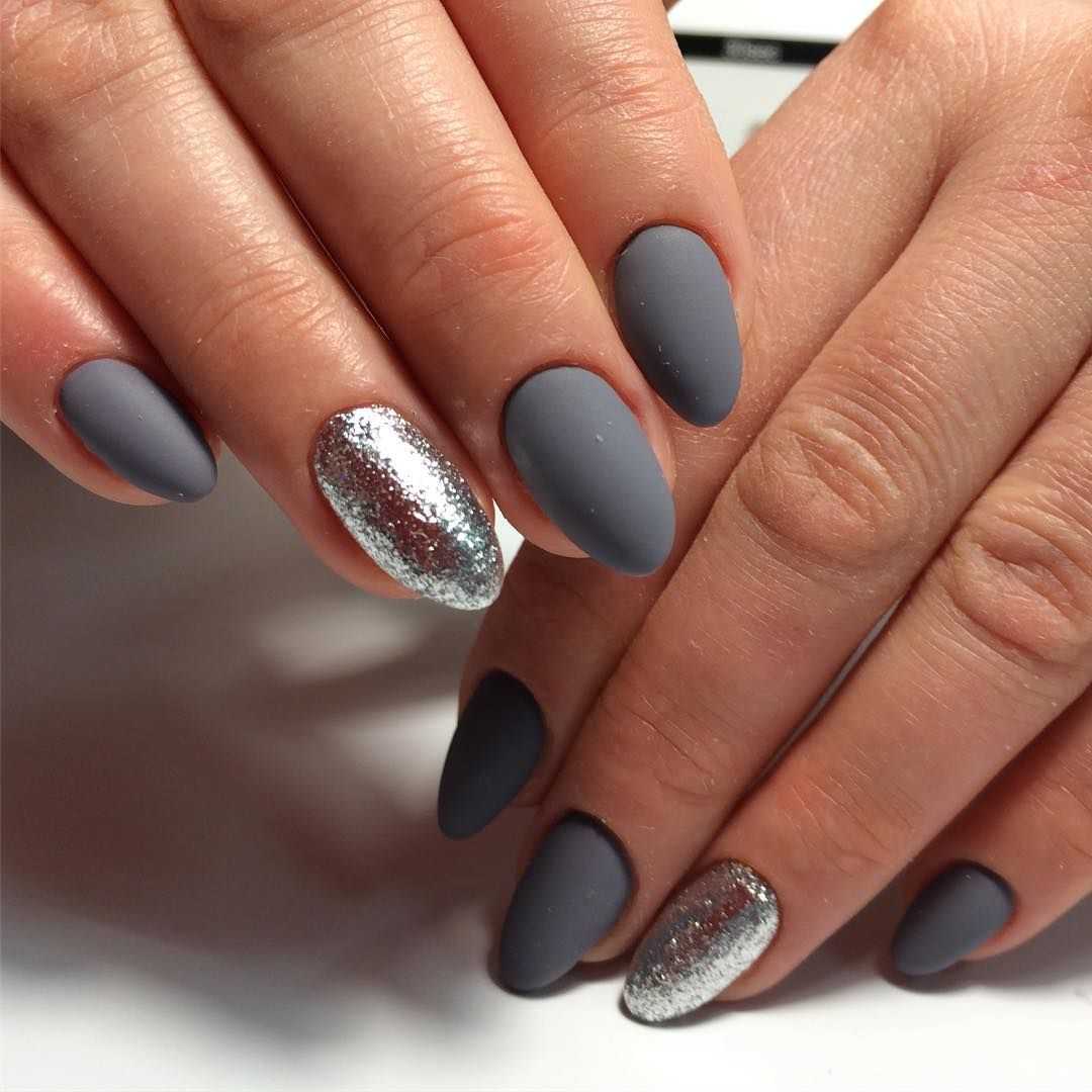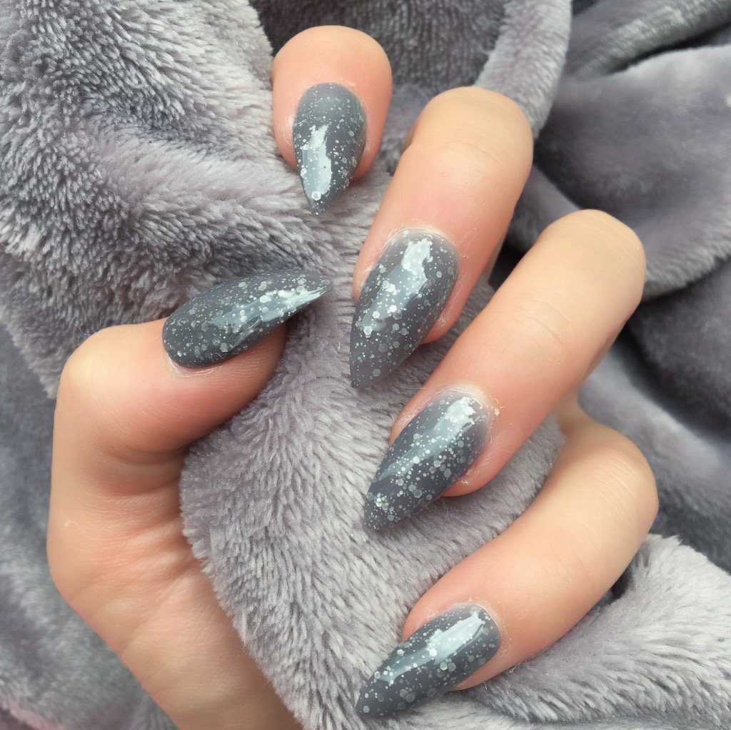 Аккуратный маникюр с угольно-серебристым покрытием будет эстетично смотреться на любых ручках.