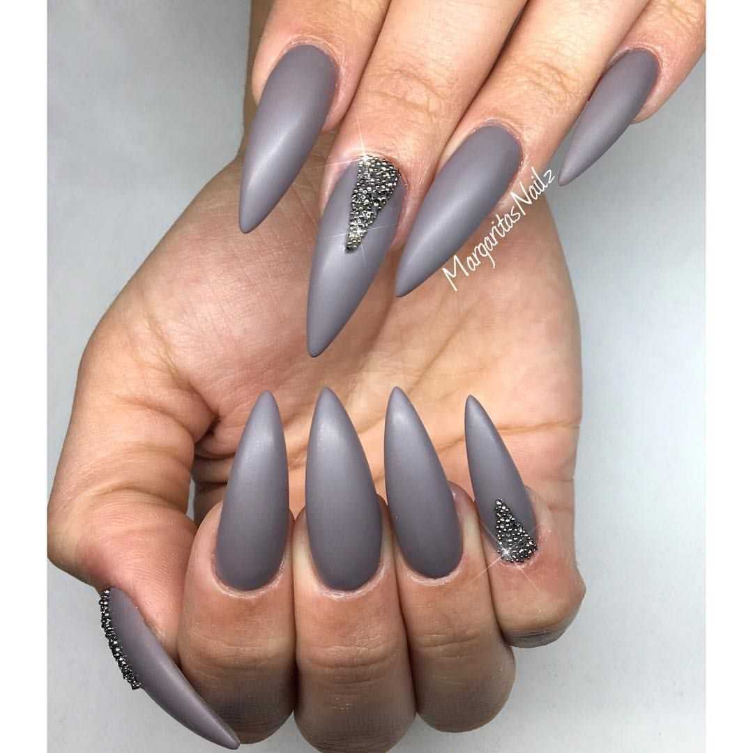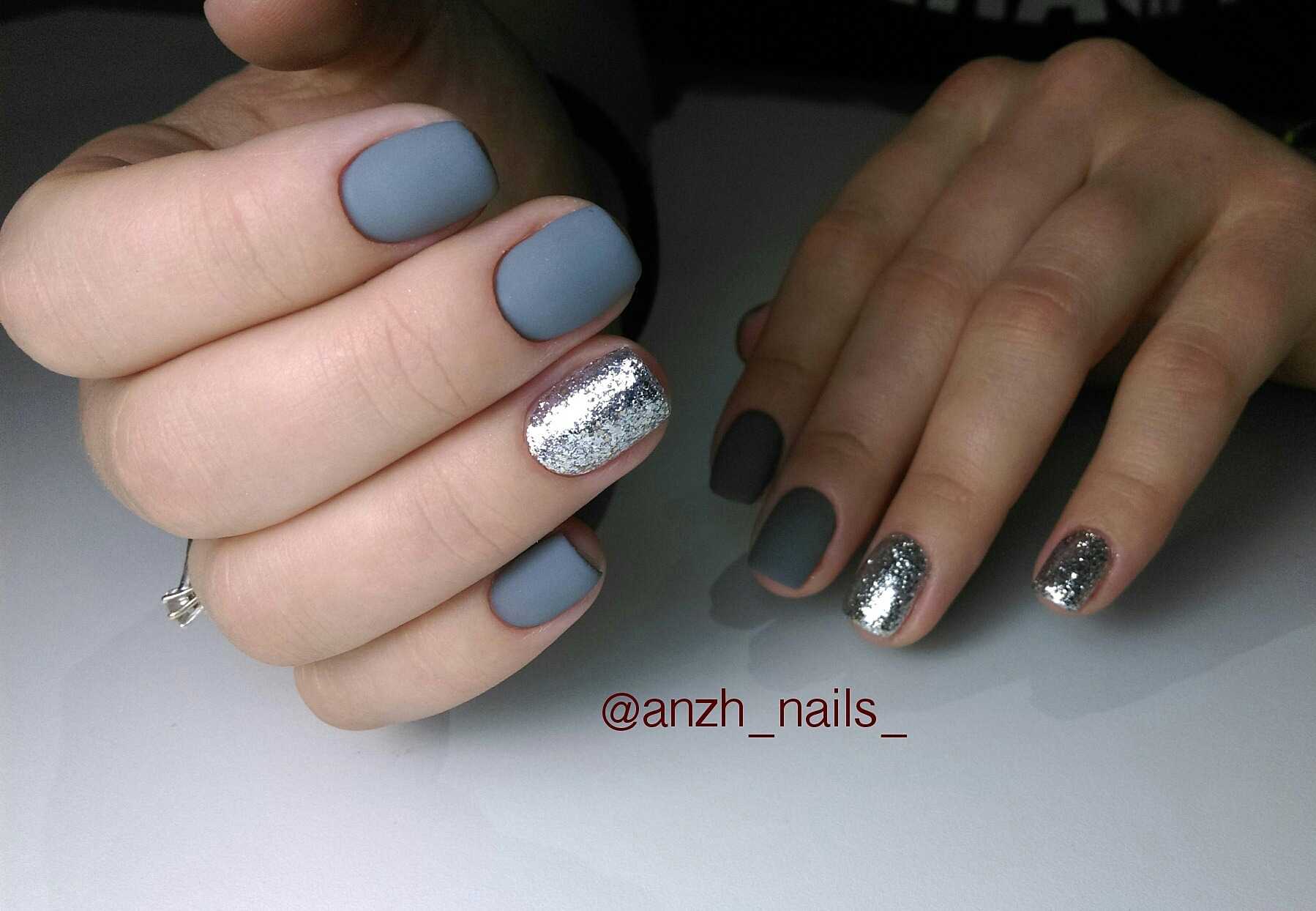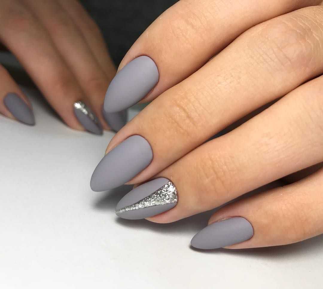 Аккуратный маникюр с угольно-серебристым покрытием будет эстетично смотреться на любых ручках.