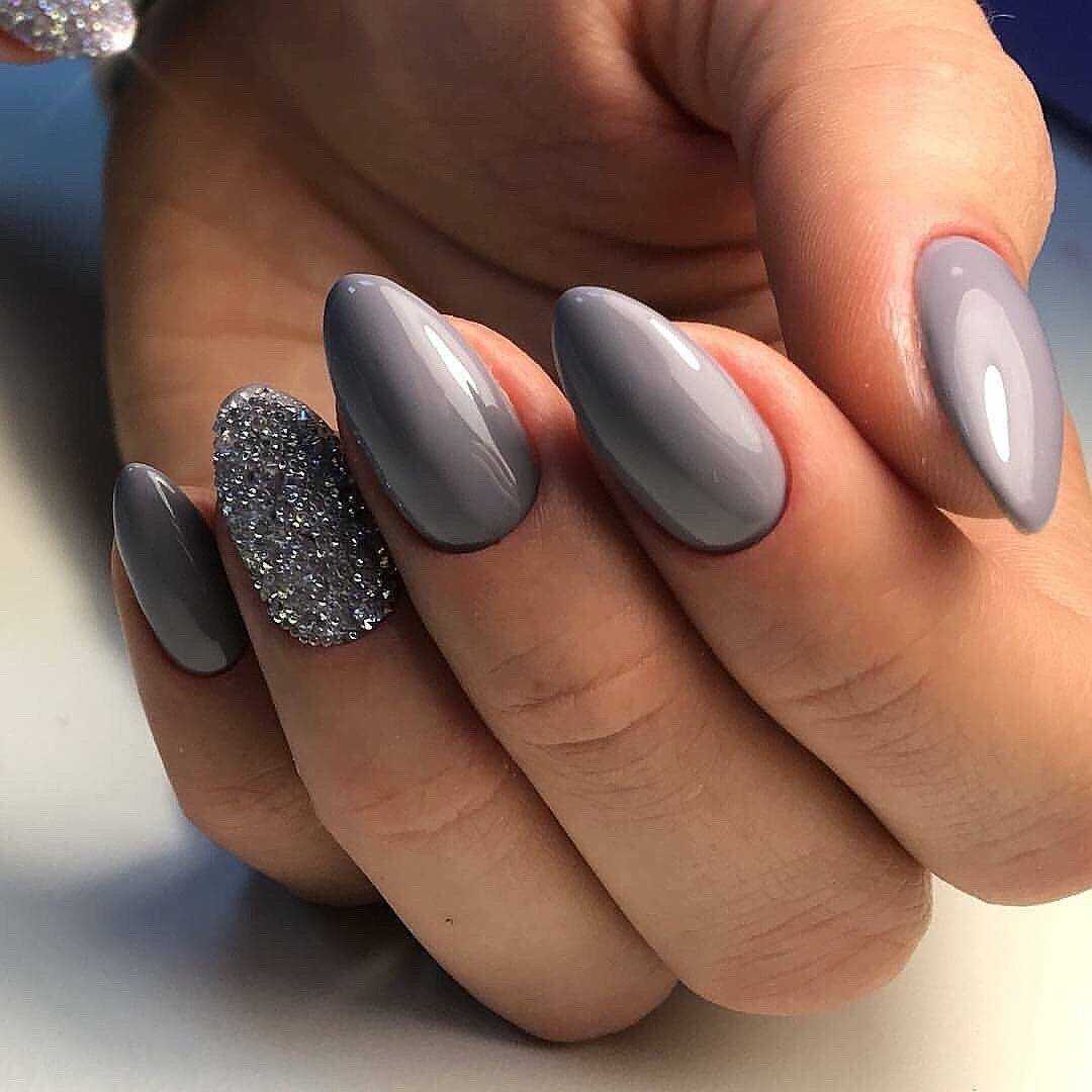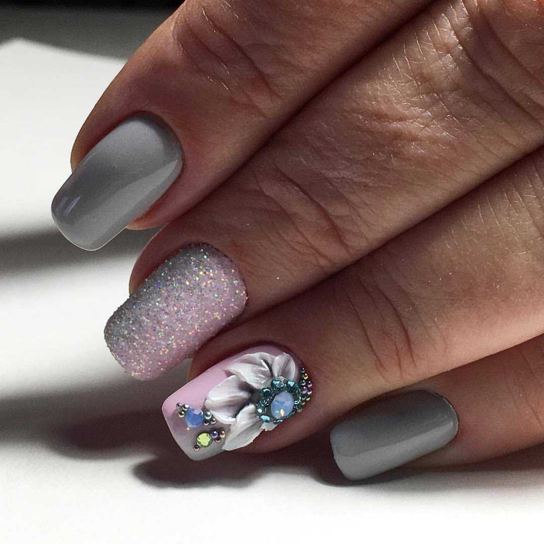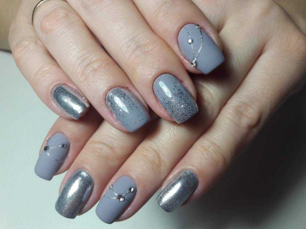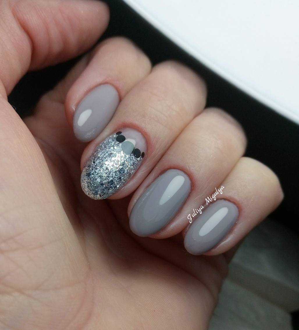 Мы уже не раз упоминали в наших публикациях о гармоничном сочетании в маникюре такого декора как стразы и блёстки, поэтому не украсить серые ноготки подобным шедевром, было бы большим упущением. Сверкающие частицы прекрасно дополняют любой вид оформления, будь то предельно сдержанный минимализм, дизайн в романтическом стиле или маникюр для вечернего образа. Украсьте узором из страз улыбку френча или основание ноготков, дополните акцентным камушком и россыпью блестящих частиц рисунки, выделите сверкающей композицией ноготок на безымянном пальце – любой из примеров смотрится великолепно и преобразит маникюр.