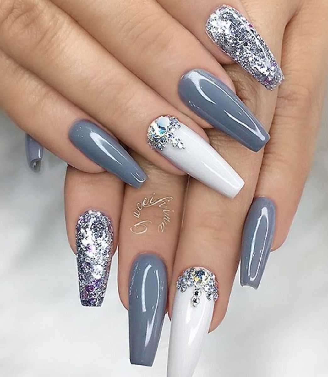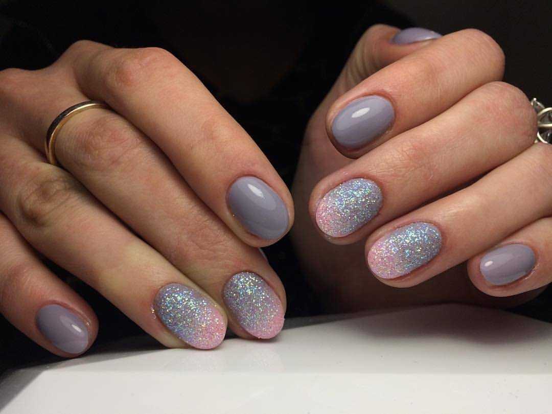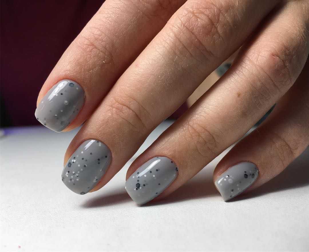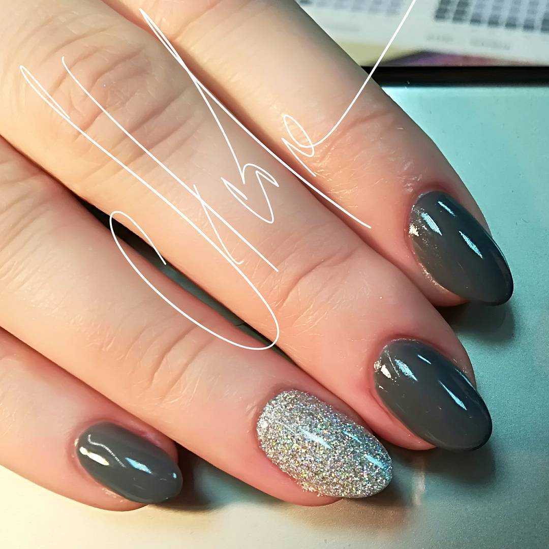 Мы уже не раз упоминали в наших публикациях о гармоничном сочетании в маникюре такого декора как стразы и блёстки, поэтому не украсить серые ноготки подобным шедевром, было бы большим упущением. Сверкающие частицы прекрасно дополняют любой вид оформления, будь то предельно сдержанный минимализм, дизайн в романтическом стиле или маникюр для вечернего образа. Украсьте узором из страз улыбку френча или основание ноготков, дополните акцентным камушком и россыпью блестящих частиц рисунки, выделите сверкающей композицией ноготок на безымянном пальце – любой из примеров смотрится великолепно и преобразит маникюр.