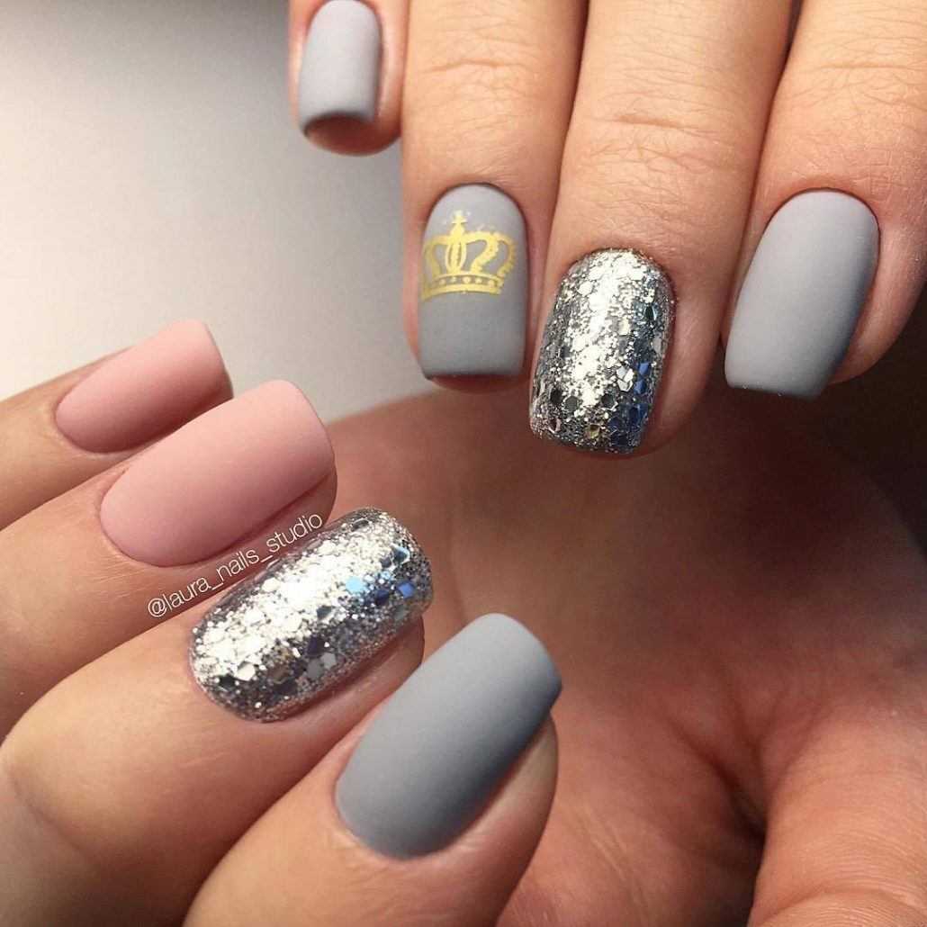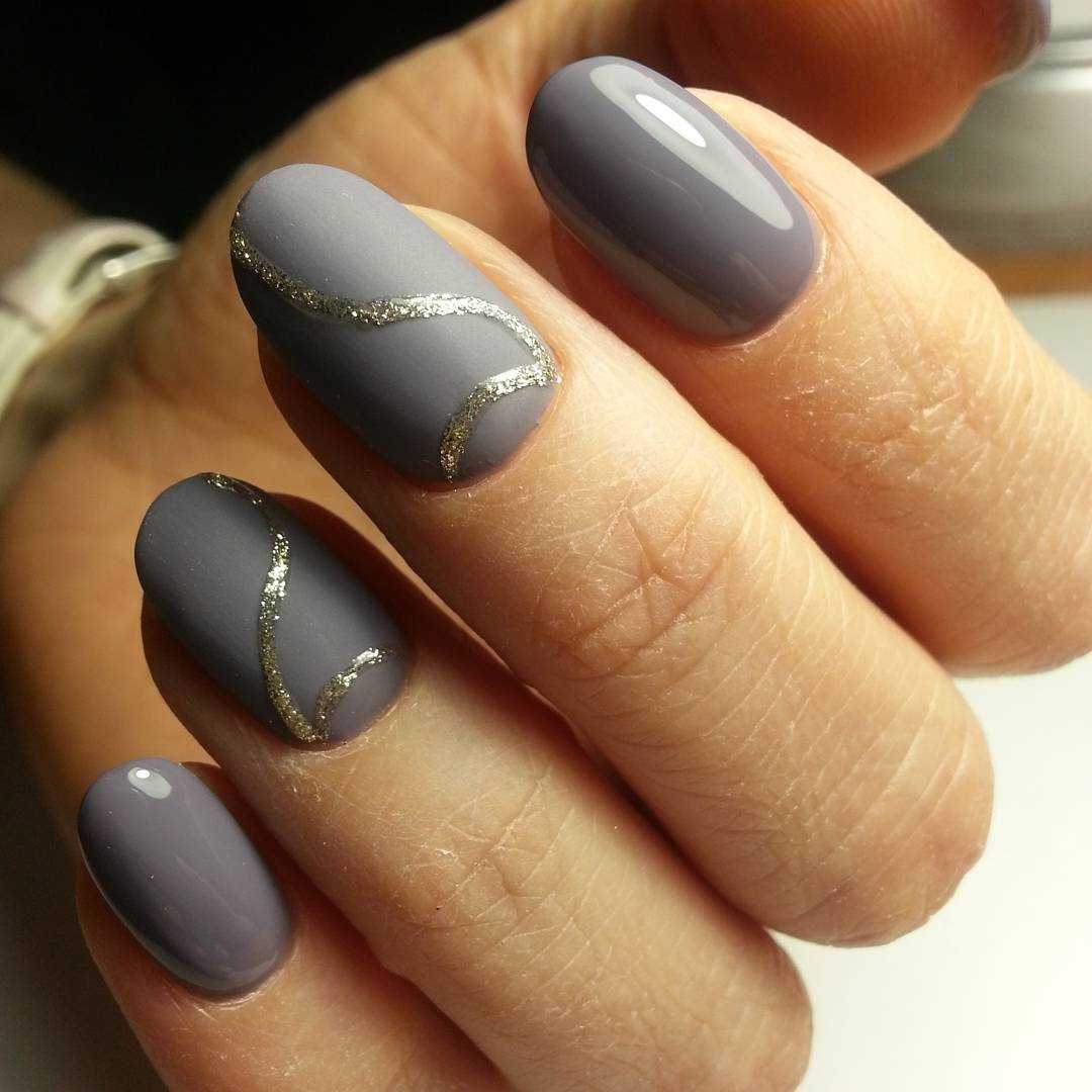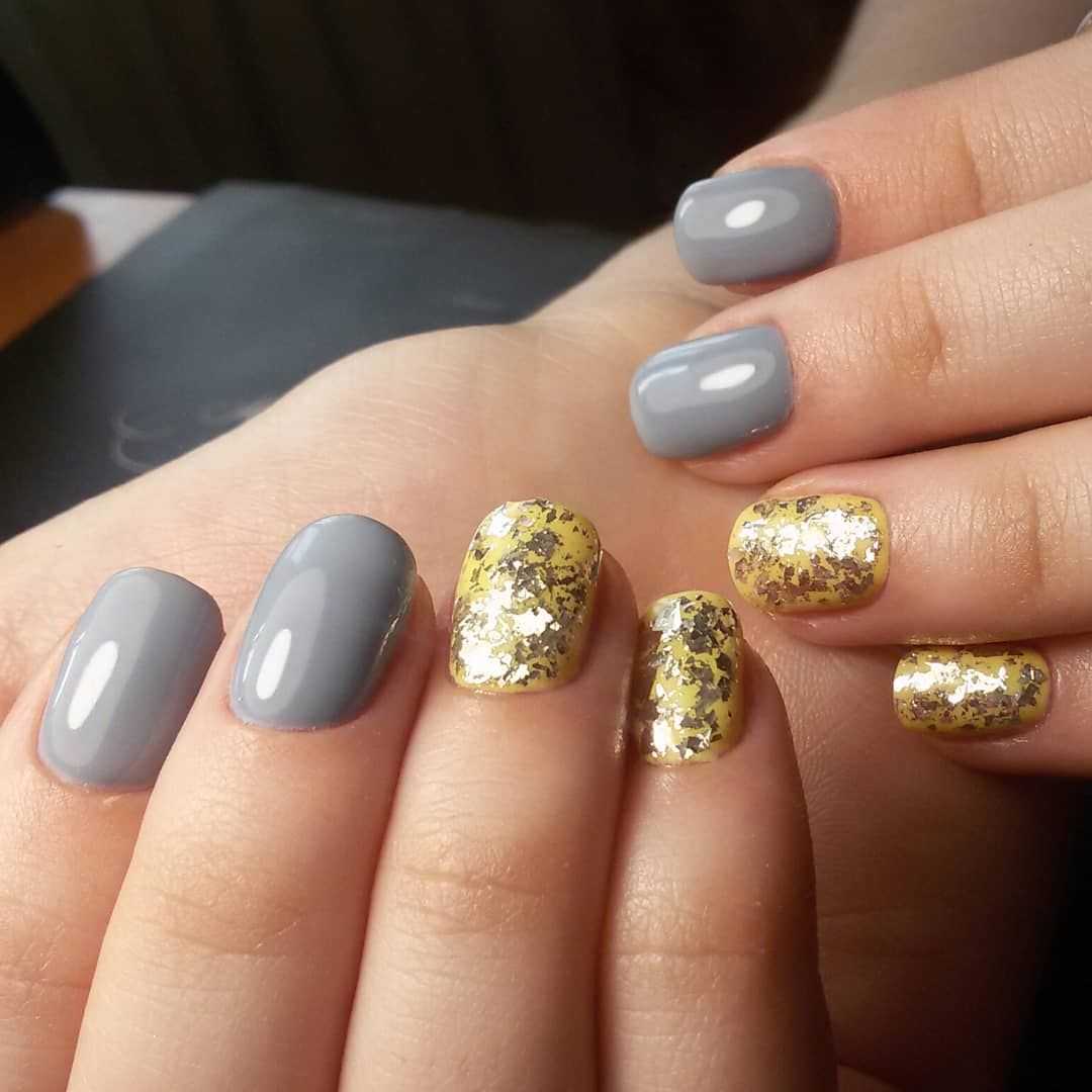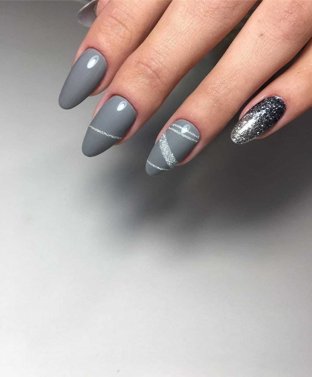 Не менее привлекательно смотрится на ногтях серая палитра с золотом и серебром. Обыграть это предложение можно при помощи различных элементов декора, например, металлизированных полос, блёсток глиттера, бусин, кристаллов или фольги. Кстати, все блестящие или сверкающие детали могут дублировать по цвету любой используемый, кроме серого, оттенок.