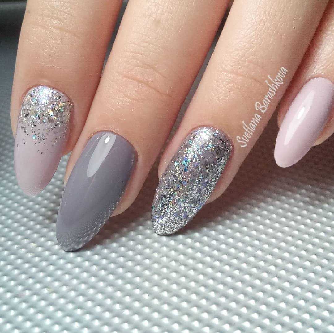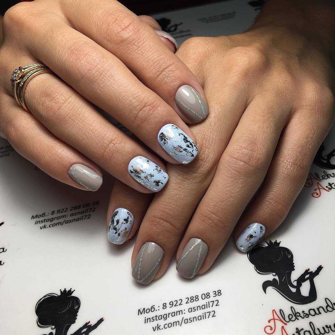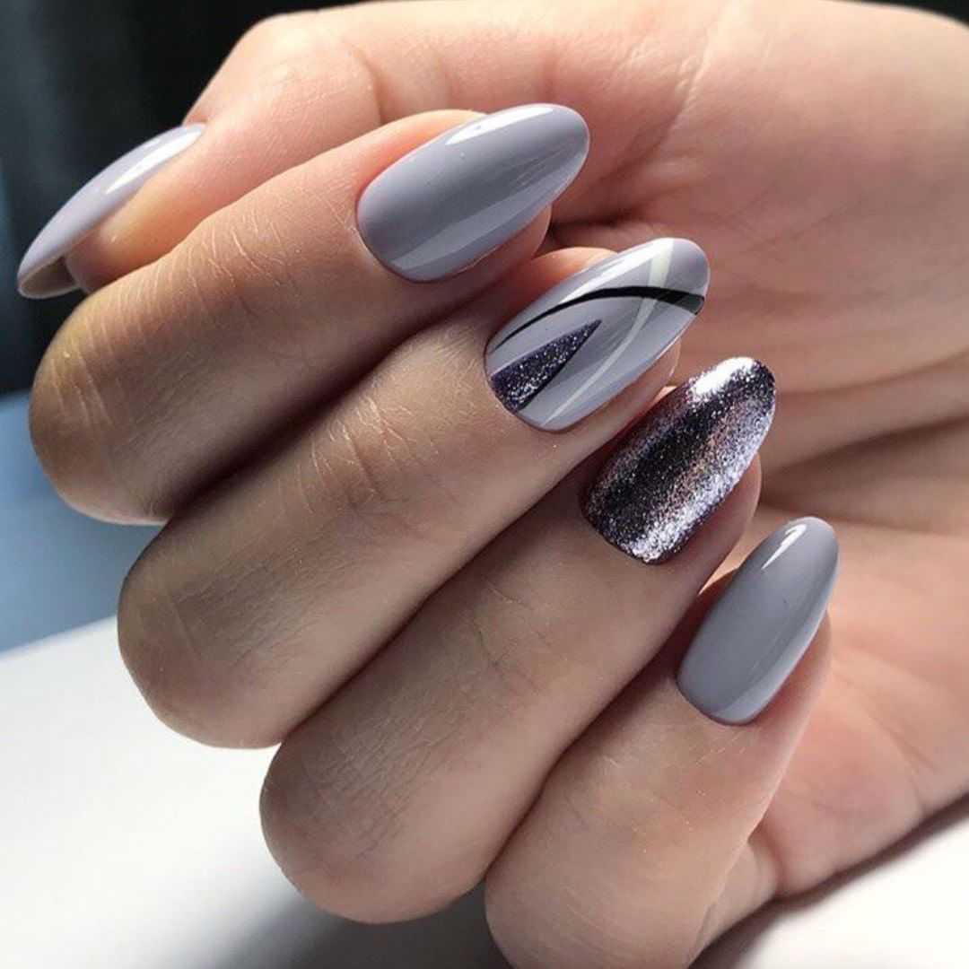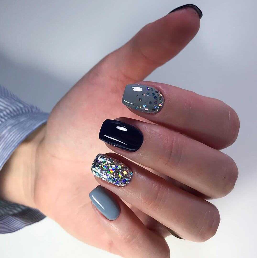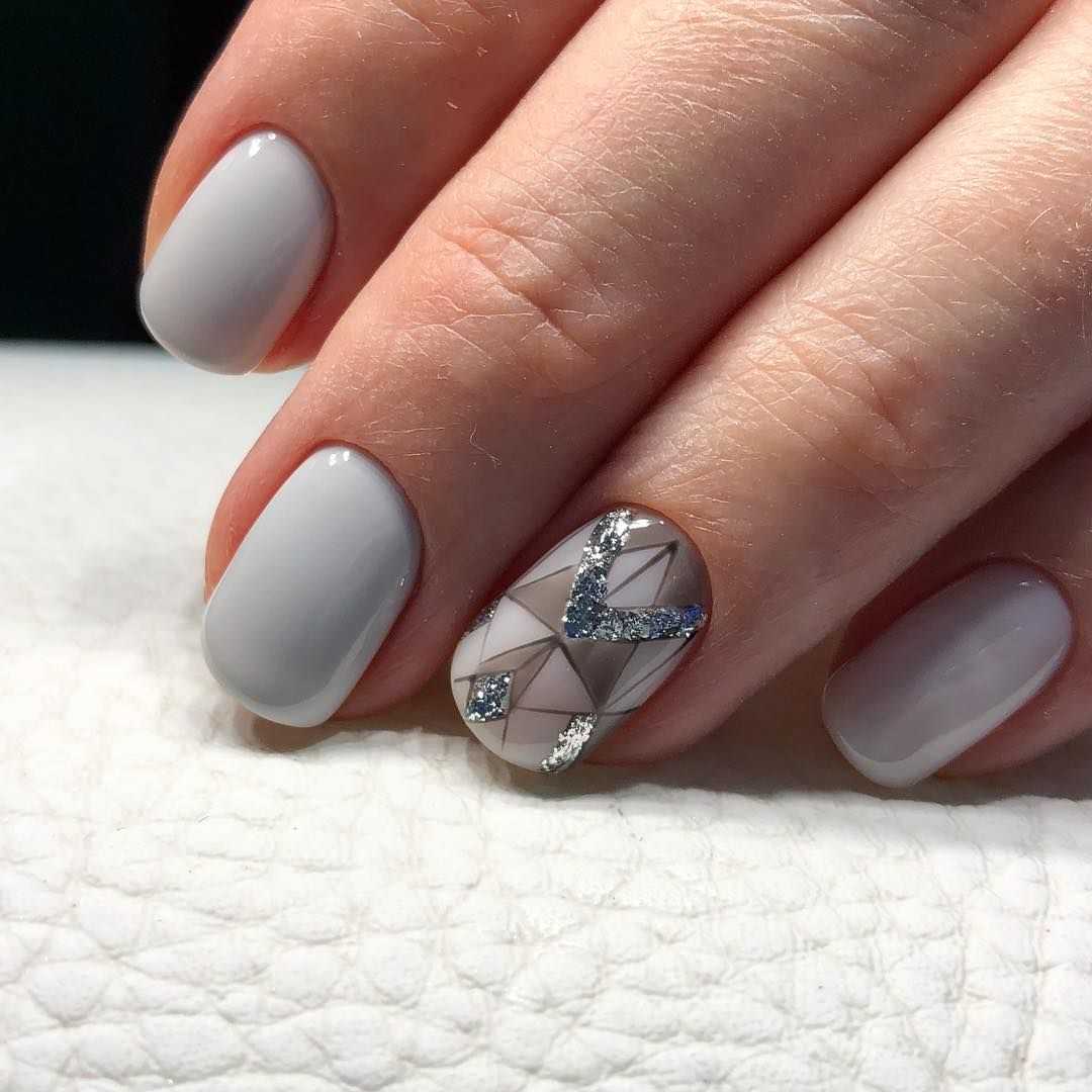 Не менее привлекательно смотрится на ногтях серая палитра с золотом и серебром. Обыграть это предложение можно при помощи различных элементов декора, например, металлизированных полос, блёсток глиттера, бусин, кристаллов или фольги. Кстати, все блестящие или сверкающие детали могут дублировать по цвету любой используемый, кроме серого, оттенок.