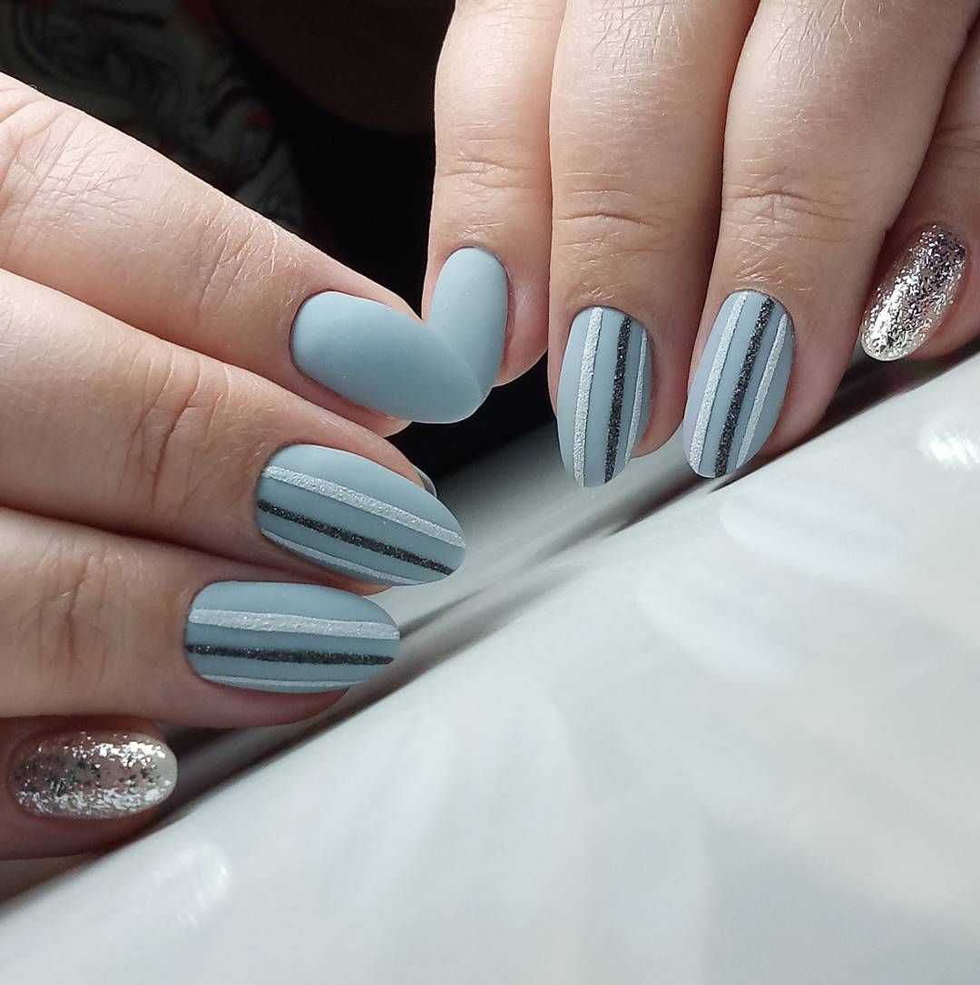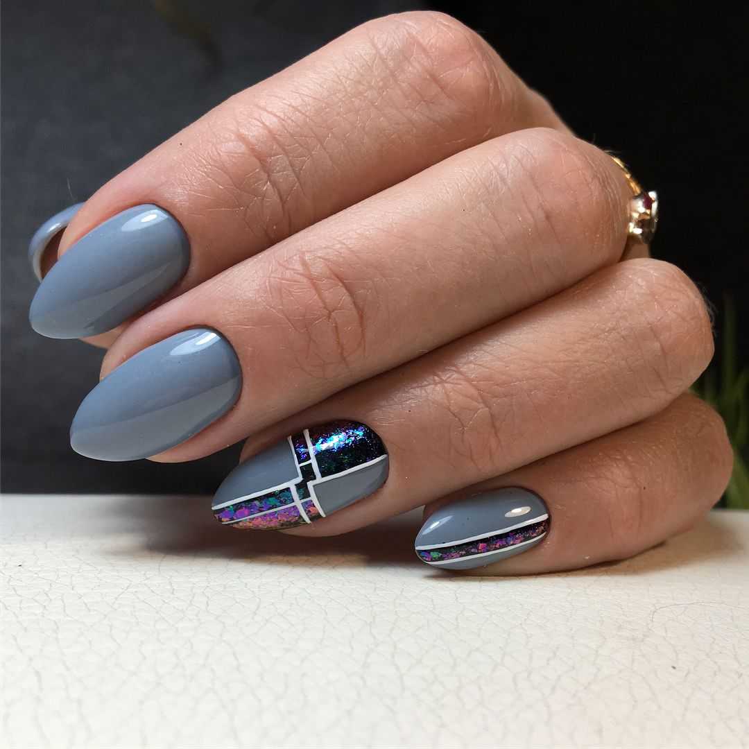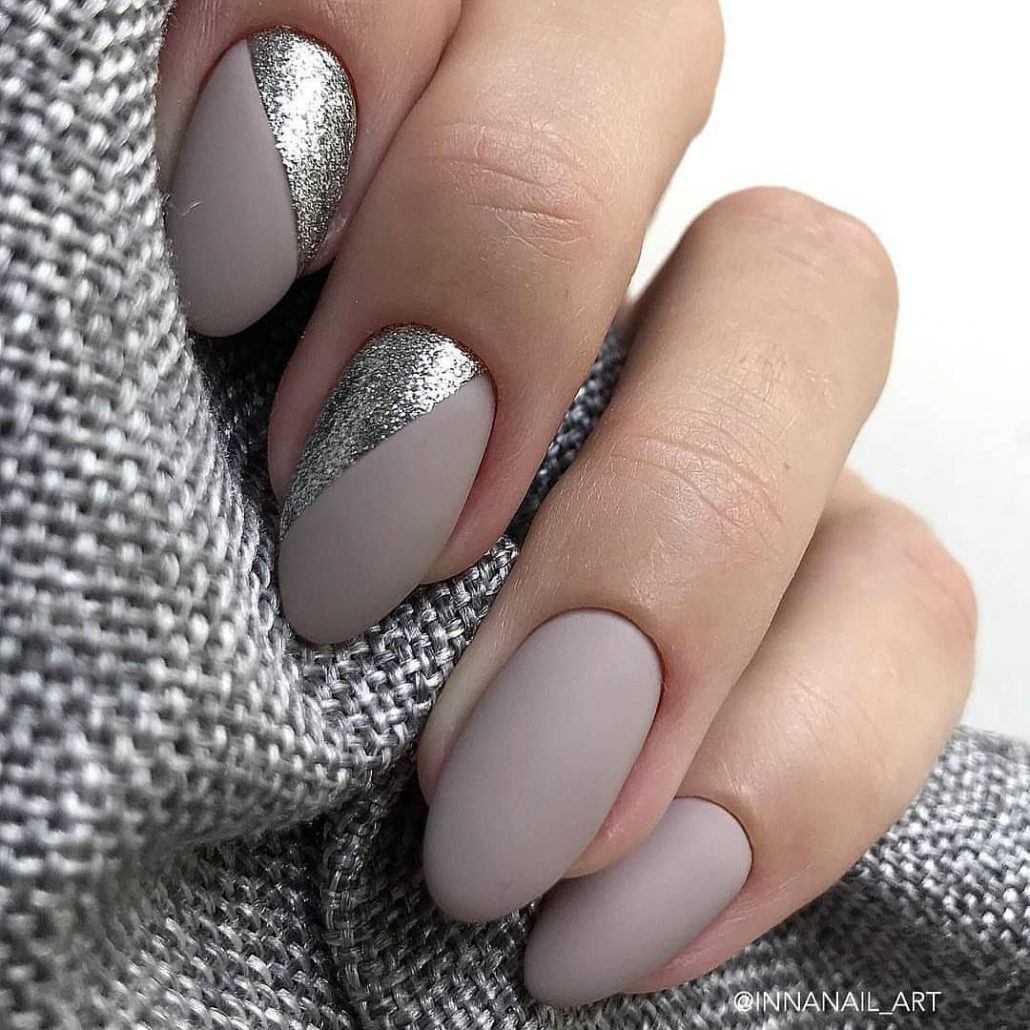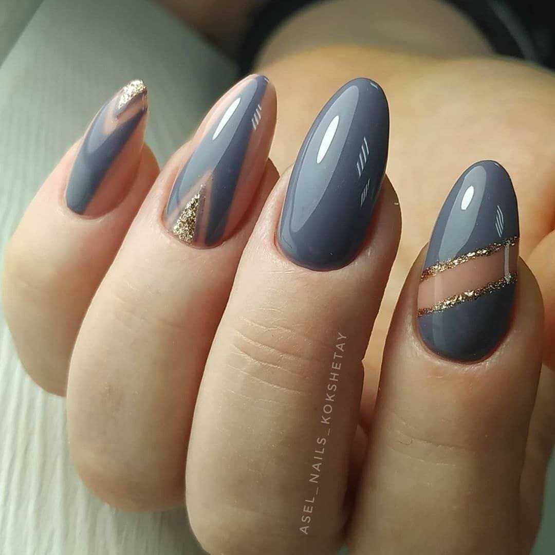 Не менее привлекательно смотрится на ногтях серая палитра с золотом и серебром. Обыграть это предложение можно при помощи различных элементов декора, например, металлизированных полос, блёсток глиттера, бусин, кристаллов или фольги. Кстати, все блестящие или сверкающие детали могут дублировать по цвету любой используемый, кроме серого, оттенок.