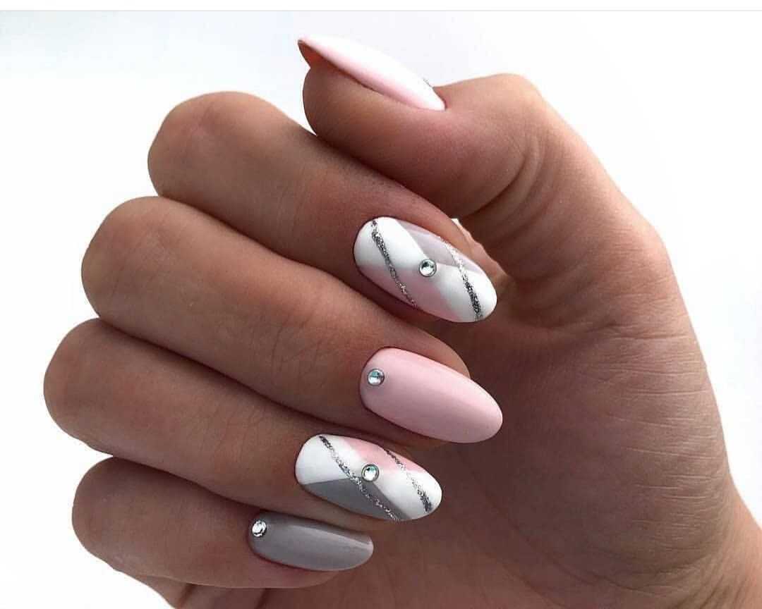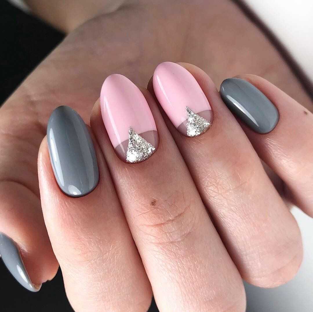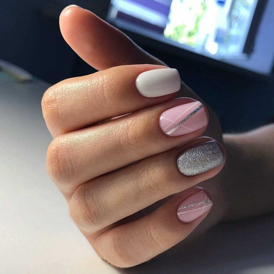 Чтобы разбавить «скучный» маникюр пинк-грей, мастера рекомендуют добавить графичные линии, поиграть на контрастах.