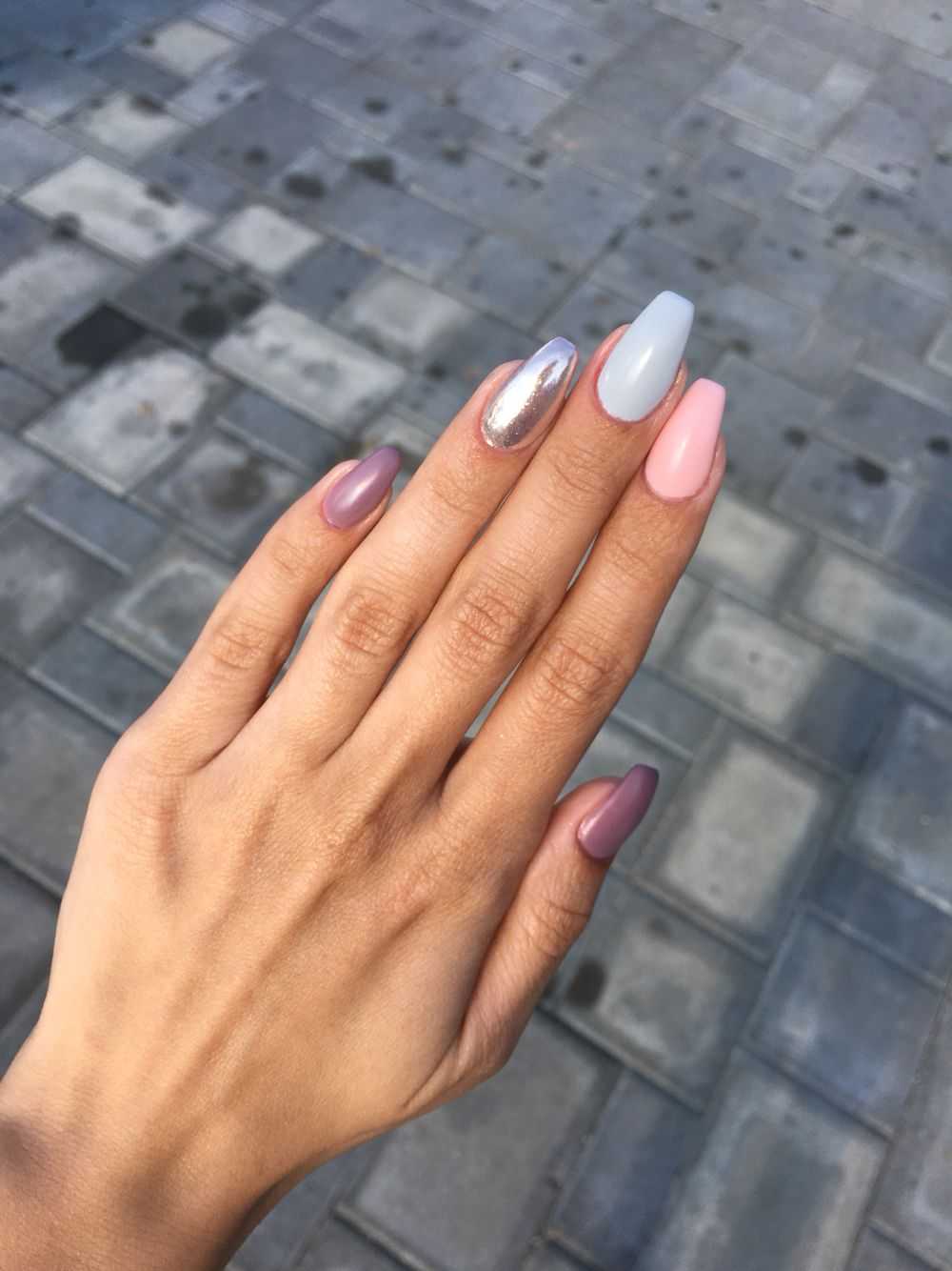 Пастельные оттенки маникюра – удачное и универсальное сочетание в дуэте цветов. Они уместны для любого повода: на каждый день или даже на свадьбу. Невесты используют однотонное покрытие с небольшим количеством элементов декора. При повседневной носке пинк-грей в пастельных тонах дополнит любой образ. Он ненавязчиво дополнит и сольётся в ансамбле с луком.