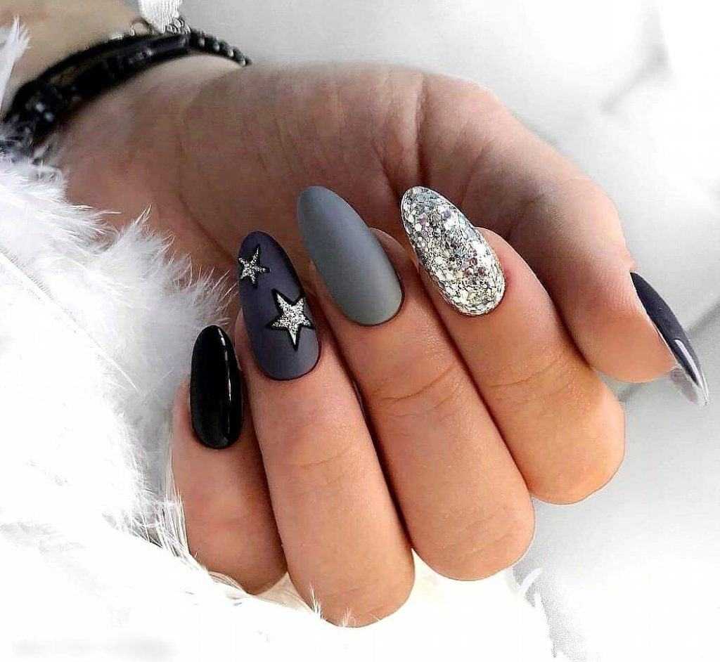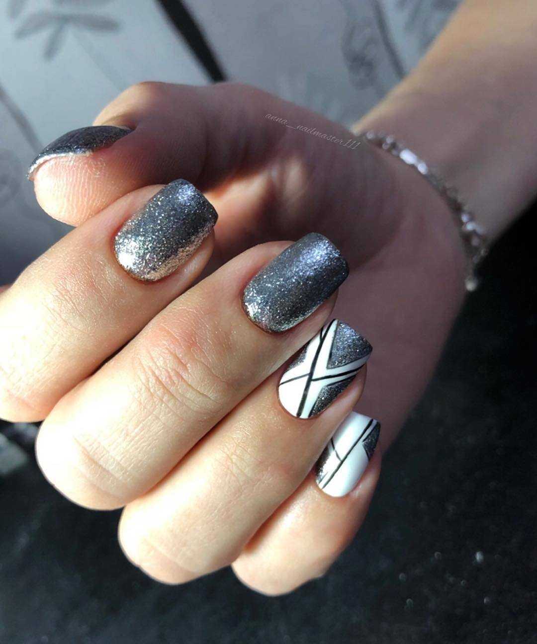 Черный дизайн ногтей с серебром на разную длину ногтей