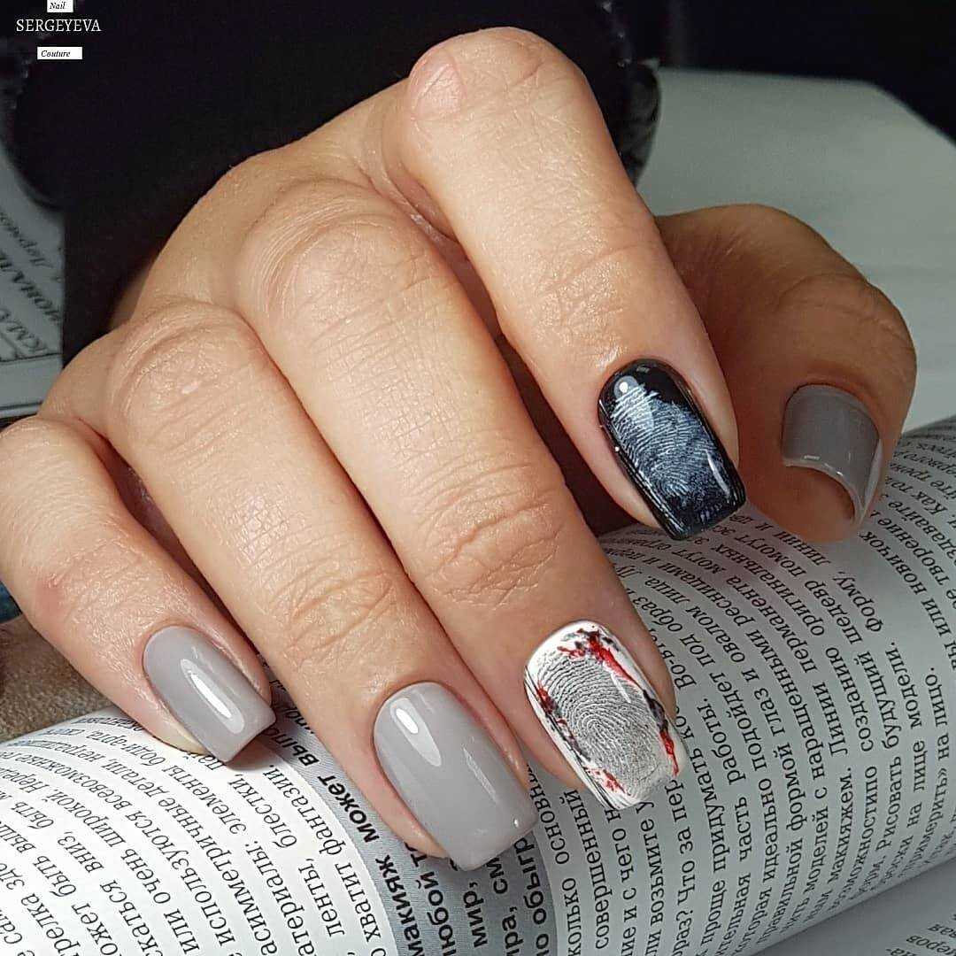 Маникюрный дуэт серого и чёрного лака смотрится не менее привлекательно, чем композиции с другими оттенками. Чёрный при этом может использоваться как для полного покрытия ногтевых пластин, так и для прорисовки деталей и выделения некоторых областей ноготка. В качестве примера, мы предлагаем покрыть два-три ноготка чёрным цветом, а на остальные нанести выбранный серый тон и украсить лунки при помощи блёсток. Не менее интересно смотрятся на светло-сером фоне чёрные вуалевые рисунки и всевозможные завитки с блестящей прорисовкой, геометрические изображения и флористические фрагменты в стиле минимализм. Модный чёрно-серый тандем лаков – это анималистика, мрамор, маникюр с рамкой, абстрактные потёки и «острова» на прозрачной основе. Какой из дизайнов украсит ваши ноготки, зависит только от вашего предпочтения.